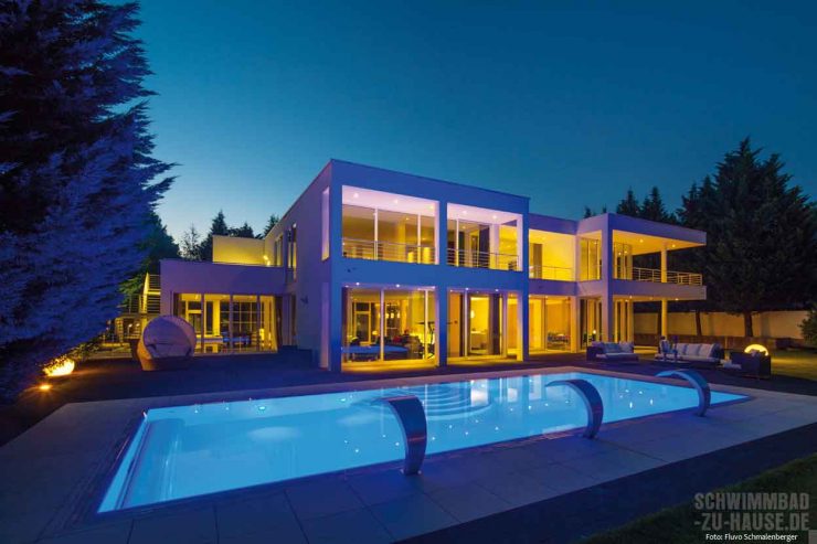 Ähnlich individuell wie bei der Wahl eines Beckentypen verhält es sich auch mit der Lichtgestaltung des eigenen Pools. Hier scheinen die Möglichkeiten schier unendlich: Dimmfunktionen, verschiedene Farbintensitäten und smarte, vorprogrammierbare Lichtszenarien. Hierbei sollte man bedenken, dass vor allen Dingen das Material des Beckens die Wirkung des Lichts beeinflusst. Generell gilt: Je dunkler das Becken, desto mehr Licht.