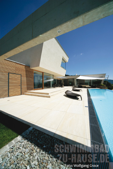 Die Ausgangssituation: Ein nach Süden leicht abfallender Hang inmitten von anderen Einfamilienhäusern. Bedingt durch die Lage, Aussicht und Nachbarschaftssituation wurde der Baukörper terrassenartig geschichtet – so ist eine gute Einbettung in den Hang gewährleistet. Das Haus umschließt nun u-förmig die Terrasse, schirmt diese komplett vor fremden Blicken ab. Dieser Platz ist der Lebensmittelpunkt des Paares und gleichzeitig das Epizentrum der Wellnesslandschaft. Dort, mittig auf der Terrasse, liegt auch das Schwimmbad. Das 18 Meter lange Edelstahlbecken ist mit Überlaufrinnentechnik ausgestattet. Für die Architektin Marion Wicher ein klares ästhetisches Merkmal: „Es ist schöner, wenn man beim Schwimmen über den Poolrand sehen kann“, sagt sie, „so hat man das Gefühl eines endlosen Horizonts.“ Das Becken bekam eine hellblaue Folie, denn Wicher ist eine Vertreterin des Natürlichen, wie Sie selbst sagt: „Und am Natürlichsten wirkt es, wenn das Wasser hell-bläulich schimmert.“ Als Poolabschluss wurde, passend zur Edelstahlrinne, eine Edelstahlkante gewählt. Das großformatige Becken wirkt hochwertig, sein Betonkubus ragt erhaben und gewaltig aus dem Hang heraus. Zu dem ebenso eindrucksvollen Betonbügel, der dem Haus entspringt und den Betonkubus andockt, kommen wir später noch. Die Pooltechnik befindet sich zusammen mit der Haustechnik im Untergeschoss des Hauses. Hier wird die Wasseraufbereitung mittels Chlor geregelt.