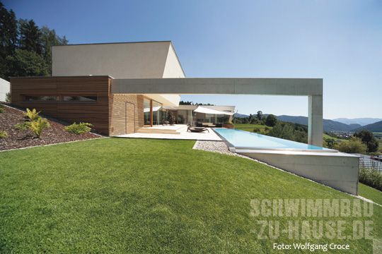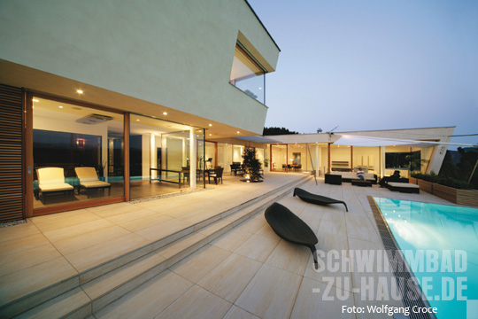 Die Ausgangssituation: Ein nach Süden leicht abfallender Hang inmitten von anderen Einfamilienhäusern. Bedingt durch die Lage, Aussicht und Nachbarschaftssituation wurde der Baukörper terrassenartig geschichtet – so ist eine gute Einbettung in den Hang gewährleistet. Das Haus umschließt nun u-förmig die Terrasse, schirmt diese komplett vor fremden Blicken ab. Dieser Platz ist der Lebensmittelpunkt des Paares und gleichzeitig das Epizentrum der Wellnesslandschaft. Dort, mittig auf der Terrasse, liegt auch das Schwimmbad. Das 18 Meter lange Edelstahlbecken ist mit Überlaufrinnentechnik ausgestattet. Für die Architektin Marion Wicher ein klares ästhetisches Merkmal: „Es ist schöner, wenn man beim Schwimmen über den Poolrand sehen kann“, sagt sie, „so hat man das Gefühl eines endlosen Horizonts.“ Das Becken bekam eine hellblaue Folie, denn Wicher ist eine Vertreterin des Natürlichen, wie Sie selbst sagt: „Und am Natürlichsten wirkt es, wenn das Wasser hell-bläulich schimmert.“ Als Poolabschluss wurde, passend zur Edelstahlrinne, eine Edelstahlkante gewählt. Das großformatige Becken wirkt hochwertig, sein Betonkubus ragt erhaben und gewaltig aus dem Hang heraus. Zu dem ebenso eindrucksvollen Betonbügel, der dem Haus entspringt und den Betonkubus andockt, kommen wir später noch. Die Pooltechnik befindet sich zusammen mit der Haustechnik im Untergeschoss des Hauses. Hier wird die Wasseraufbereitung mittels Chlor geregelt.