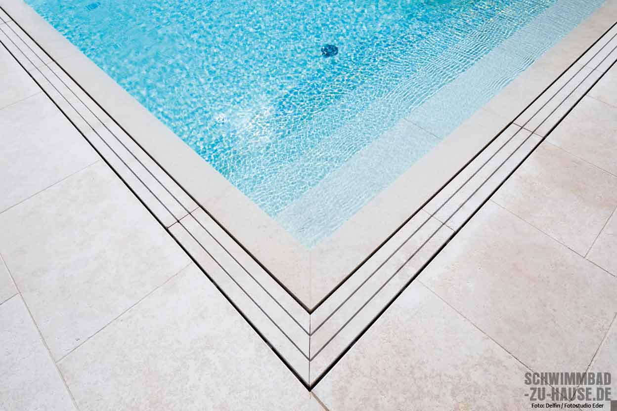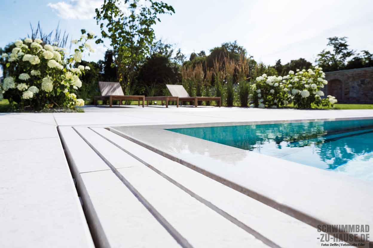 Weil die Bauherren bereits seit vielen Jahren bei Service und Wartung eines anderen Schwimmbads positive Erfahrungen mit den Poolprofis von Delfin Wellness aus Leonding bei Linz gemacht hatten, setzte man auch bei der Planung und Umsetzung des neuen Schwimmbeckens auf dieses Team. Martin Mittermayr, der mit dieser Aufgabe betraut wurde, erinnert sich im Interview mit haus+wellness*: „Das hochwertige Schwimmbad sollte sich harmonisch in die Architektur des Gartens einfügen. Weil die Bauherren überaus gerne schwimmen, standen zudem auch eine stattliche Beckenlänge sowie eine Gegenstromanlage ganz oben auf der Wunschliste.“ Das i-Tüpfelchen des Freibads sollte nicht zuletzt eine Rollladenabdeckung sein, die das mit einer Wärmepumpe beheizte Becken bis in die kühleren Herbstmonate hinein vor Wärmeverlusten schützt – und somit die Badesaison verlängert.