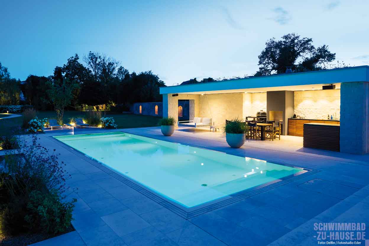 Neben der Optik kam auch den technischen Features höchste Aufmerksamkeit zu: Ein Konglomerat aus Gegenstromanlage, Unterwasserbeleuchtung, Poolheizung, Unterflurabdeckung und Pumpe mit Frequenzumrichter sorgt für Abwechslung im Becken – und zugleich für einen effizienten Umgang mit Energie.