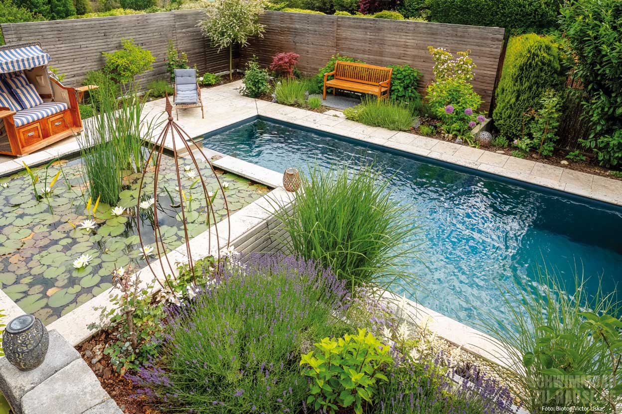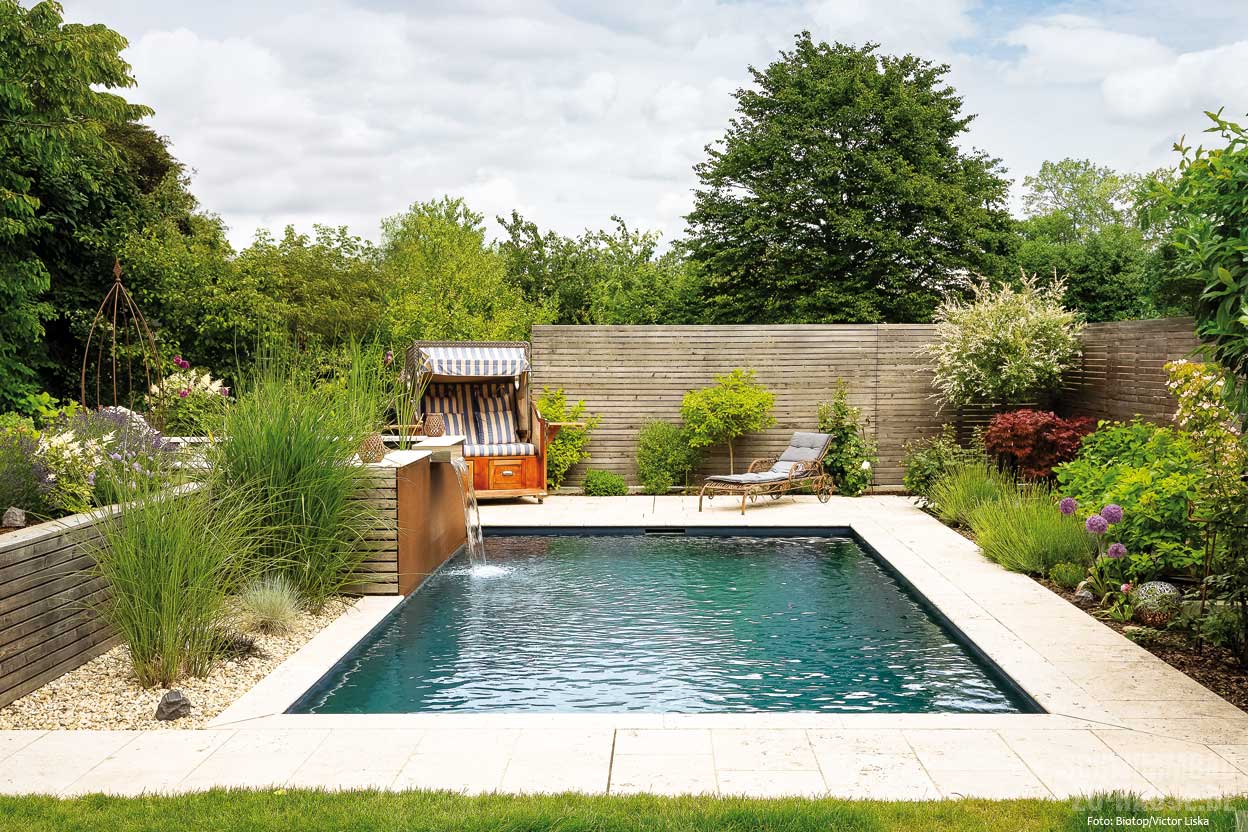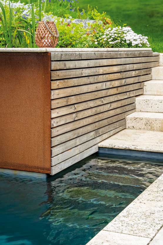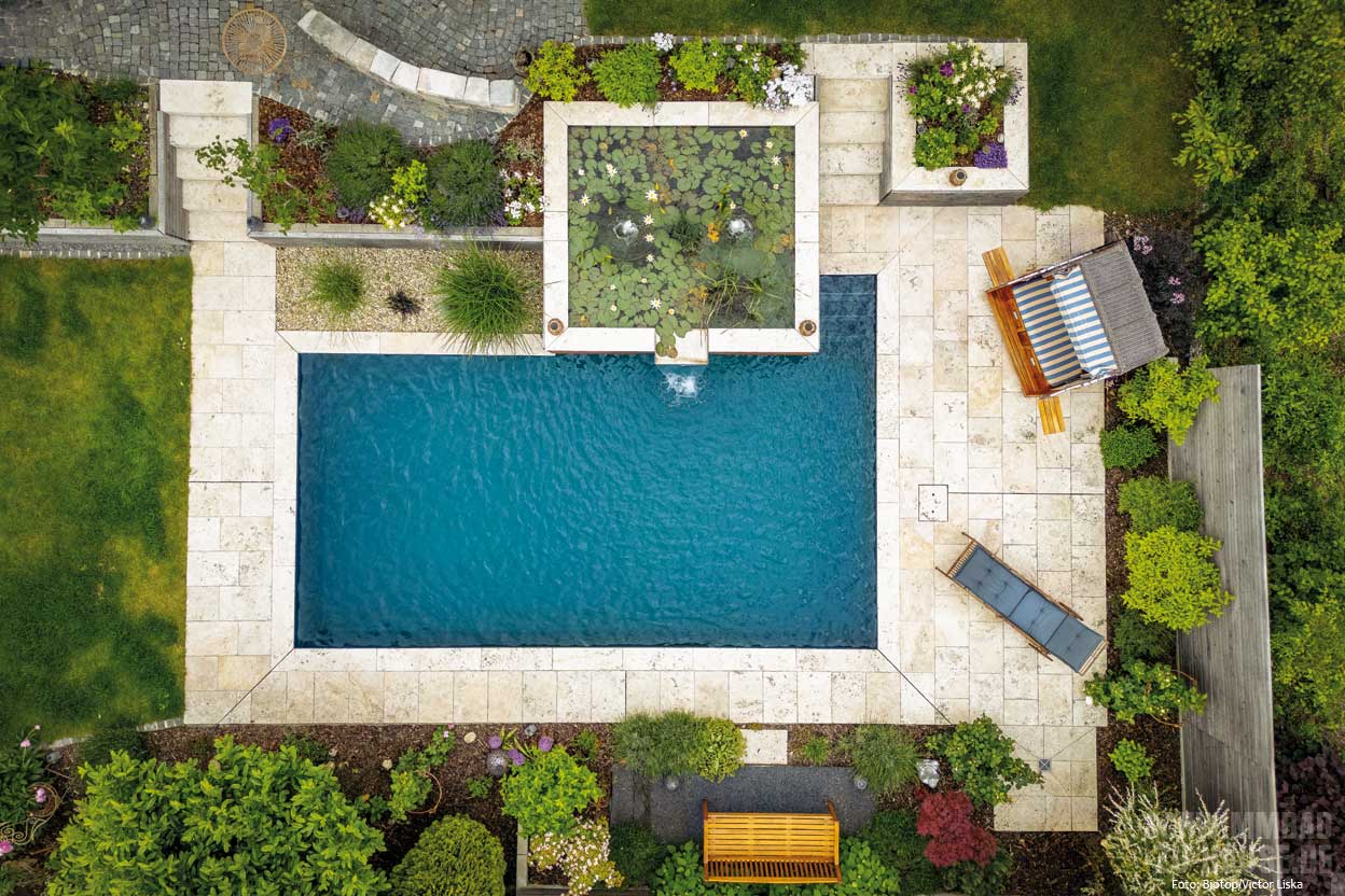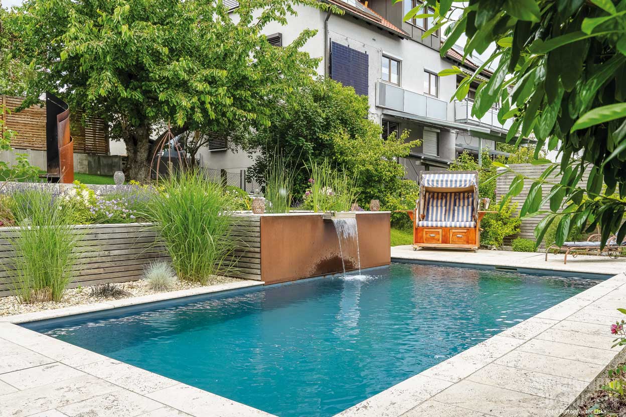 Gemeinsam wurde ein architektonisches Konzept für die Badeanlage entwickelt. Das war wegen der Hanglage des Gartens nicht einfach. „Wir wollten einen ebenerdigen Pool im unteren Bereich des Gartens. Damit war klar, dass wir eine Treppe brauchen. Und daraus entstand die Idee, eine Ebene höher ein zweites, bepflanztes Becken zu bauen, aus dem das Wasser über eine Stufe in den Pool plätschert“, so die Besitzerin. Um die gesamte Poolanlage lebendig zu gestalten, wurde auf natürliche Materialien wie Holz, Steinplatten und verschiedene Wasserpflanzen wie Seerosen und Gräser sowie zwei Wasserspeier gesetzt.