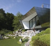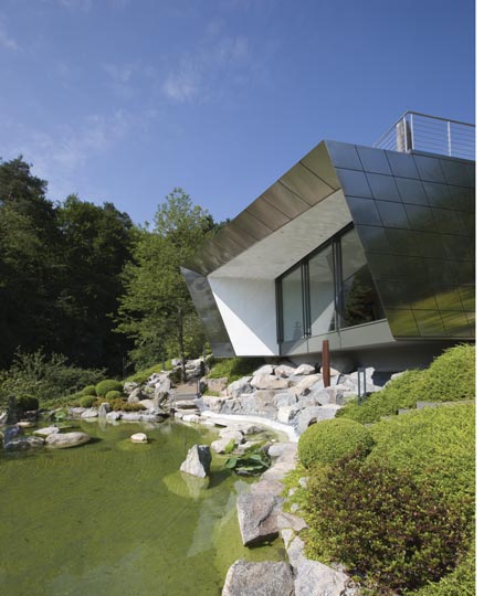 Rechter Hand vom Schwimmbad führt eine Treppe nach unten, vorbei an dem überhängenden Schwimmbad. Der auskragende Beckenteil wurde mit Holzpaneelen verkleidet, wodurch er sich harmonisch in die natürliche Gestaltung der Gartenanlage einfügt. Der Weg führt neben dem unterhalb des Schwimmbad entspringenden Bachlauf weiter zu einem großen Teich. Über diesem fasziniert eine weitere Auskragung – der Wohnbereich im Untergeschoss des Hauses wurde ebenfalls über den Hang hinaus verlängert. Von seiner großen Glasfront aus haben die Jandas eine wunderbare Aussicht über Teich und Umgebung. Auf einem Pfad aus großen Felsbrocken gelangt man über den Teich zu einer weiteren Treppe, die zum Obergeschoss des Hauses zurückführt.
