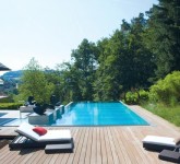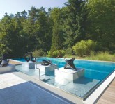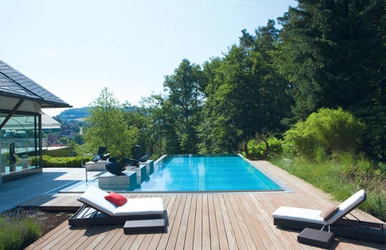 Mit der modernen Steuerungstechnik können die Jandas jetzt alle Funktionen der Wasseraufbereitung, der Poolbeleuchtung und des Whirlpools komfortabel über einen Touchscreen steuern. Damit die Energiekosten gering bleiben, bekam das maßgefertigte Edelstahl-Schwimmbad eine unterirdische Rollladenabdeckung, deren Wickelvorrichtung unsichtbar in einer Nische am Kopfende des Beckens untergebracht ist. Doch auch die gute Beckenisolierung sowie die Nachtabschaltung der Überflutungstechnik sparen Geld. Neben der technischen Ausstattung kam schließlich noch der harmonischen Integration in das Grundstück eine tragende Rolle zu – die umgebende Holzterrasse ist das Bindeglied zwischen Schwimmbad und dem umgebenden Grün.