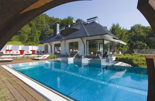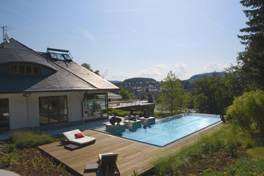 Um für sich und seine Familie Freizeitspaß und eine Fitnessmöglichkeit ins heimische Domizil zu holen, entschied sich Klaus Janda (Name von der Redaktion geändert) für einen großzügigen Außenpool – trotz der starken Hanglage seines Grundstücks. Ein Wohlfühlraum mit rundem Whirlpool und einer Sauna samt Kaltwassertauchbecken führt die Wellnessanlage im Haus fort.
