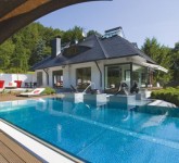 Die Wasseraufbereitungstechnik wurde von der Firma Ospa genau auf die Bedürfnisse der Wellnessanlage zugeschnitten. So kommt für das Schwimmbad eine „Ospa-Filteranlage 25“ zum Einsatz, die speziell für die Anforderungen großer oder stark belasteter Außenbäder konzipiert wurde. Filterpumpe, Steuergerät und Heizer werden bei diesem Filtertyp objektabhängig geplant. Der Whirlpool im Haus hat eine eigene „Ospa-Monoblock-Filteranlage“. Für die Wasserdesinfektion wurde eine „Ospa-Chlorozonanlage“ installiert – eine Elektrolyseanlage, die aus kostengünstigem Regeneriersalz bedarfsabhängig Desinfektionsmittel produziert und an das Badewasser dosiert. Alle Komponenten der Wasseraufbereitung werden von der Schwimmbad-Steuerung „Ospa-Blue-Control“ vollautomatisch bedient.