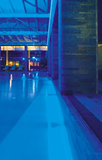 Der im Salzburger Land gelegene „Krallerhof“ hat 124 Zimmereinheiten, vom Einzel- und Doppelzimmer über Maisonetten bis hin zu diversen Suiten. Wer es noch exklusiver möchte, kann eine der 21 Luxus-Farb-Suiten wählen. Im Refugium gibt es alles, was das Wellnessherz begehrt. Neben Saunavariationen wie Tepi­darium, Laco­ni­um, Bio-Kräutersauna, Finnischer Sauna und Dampfbad warten Schwimmbad, Solegrotte, ein Whirlpool und natürlich jede Menge Beautyanwendungen auf die Gäste. Und der Ruheraum. Zahlreiche Farb­leuchten schaffen eine angenehme Stimmung in der Schwimmbad-Halle.