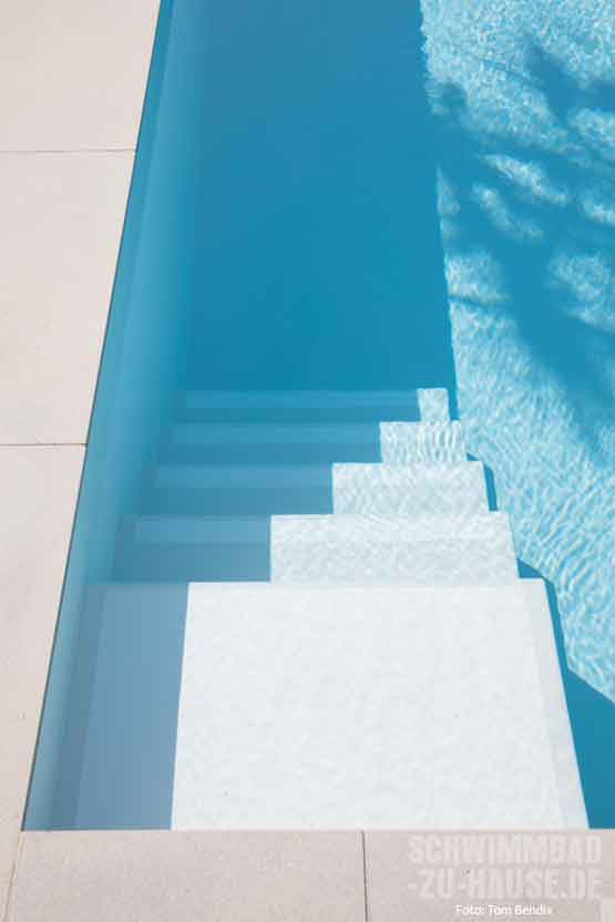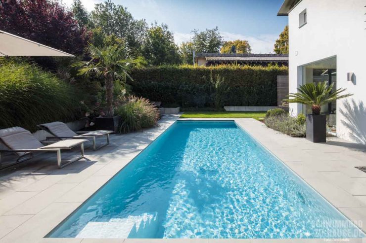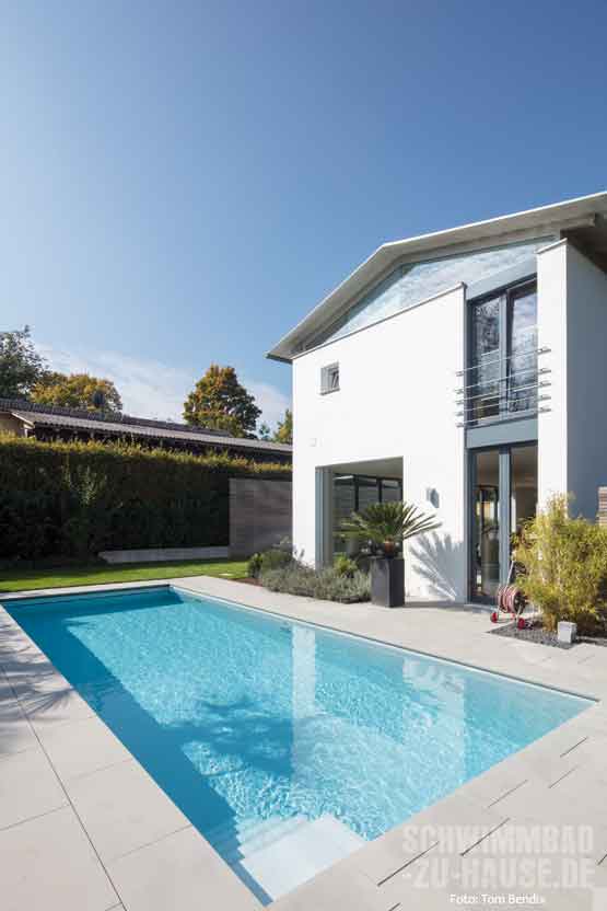 Schon immer spielte Sport bei diesen Bauherren eine wichtige Rolle. Nicht nur beruflich, sondern auch im Privaten kann das Ehepaar aus Baden-Württemberg nicht auf körperliche Aktivitäten verzichten. Besonders Schwimmen und das Element Wasser übten seit je eine große Faszination auf sie aus, sodass die Realisation des eigenen Pools im Garten hinter dem Haus nur eine Frage der Zeit und detaillierter Planung war. „Ob anspruchsvolles Schwimmtraining, als Entspannung nach dem Joggen oder Abkühlung an heißen Tagen – ein eigenes Schwimmbad hat nur Vorteile“, schwärmt der stolze Poolbesitzer im Interview mit haus und wellness*. Nachdem man sich Inspirationen bei Freunden mit Pool, in Fachzeitschriften und auch im Internet holte, ergaben sich klare Vorstellungen für das eigene Badeparadies. Jetzt fehlte nur noch der passende Poolexperte. Bei einem Treffen mit Steffen Henne in der großen Poolausstellung stand fest: Hier stimmt die Chemie.