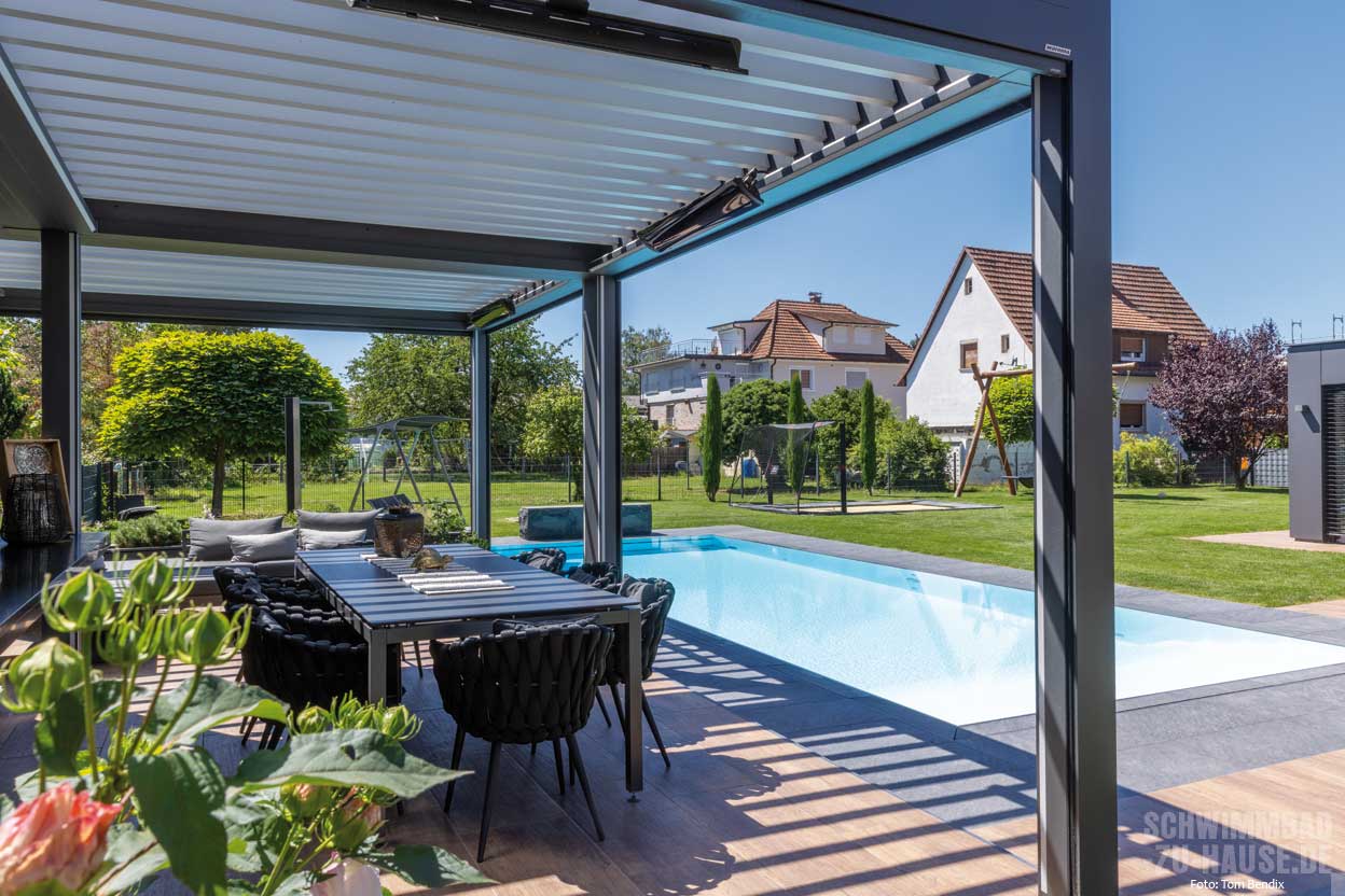 Die großzügige Pergola mit Outdoorküche und Sitzgelegenheiten bietet ein schattiges Plätzchen, von dem aus man den Pool bestens im Blick hat.