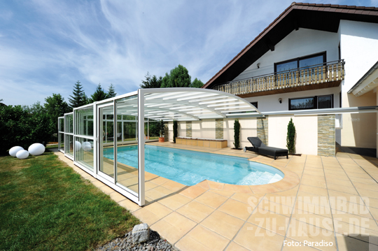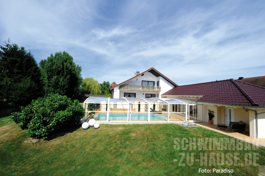 Nicht nur, dass man mit einer Poolüberdachung selbst bei Regen in seinem Freibad schwimmen kann, man spart sich auch eine Menge Geld. Denn durch den solaren Erwärmungseffekt heizen sich die Luft und das Wasser unter der Überdachung auf. Man benötigt also weniger Energie, um das Badewasser aufzuheizen. Bei dieser Wellnessanlage wurde im Zuge einer Optimierung der Poolumgehung eine wandgeführte Überdachung geplant. Diese verläuft nicht (wie oft üblich) auf Schienen, sondern auf Rollen. Die Verglasung der Überdachung besteht aus pflegeleichten 3-fach-Stegplatten mit einem K-Wert von 2,7. Diese helfen, die Wärme bei Nacht zu speichern – so ist eine Ganzjahresnutzung des Pools möglich. Nun hat die Familie viel Platz zum Baden und zum Kochen, denn auch eine großzügige Sommerküche fand neben dem Pool ihren Platz. Die Überdachung lässt sich bequem von nur einer Person aufschieben und man kann entspannt den Blick über den schönen Garten genießen.