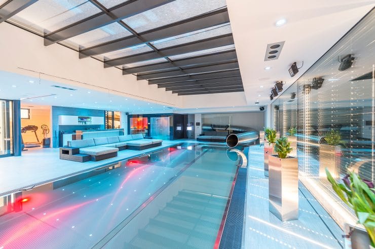Schwimmen und Relaxen: Diese schöne Indoor-Poolanlage, über der ein 14 Meter langes Glasdach eine einmalige Aussicht bietet, vereint sportliches Schwimmen und wohltuende Massage-Effekte. Dieses Glasdach stellt gleichzeitig den Boden eines zusätzlichen Outdoor- Edelstahlpools dar. Die an der Breitseite angebrachte HydroStar-Schwimmturbine erzeugt eine angenehme, kraftvolle Strömung, die den Körper gleichmäßig umfließt. Dabei lässt sich die Stärke der Strömung individuell regulieren, sodass sich das System sowohl für Wellness-Anwendungen als auch für ein ausdauerndes, anspruchsvolles Schwimmtraining eignet. Dank der leistungsfähigen Turbinen bietet die Anlage selbst Profisportlern, die gerne an ihre Grenzen gehen, ideale Trainingsbedingungen.