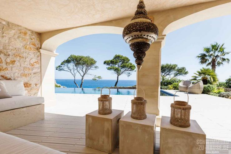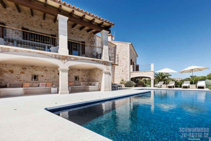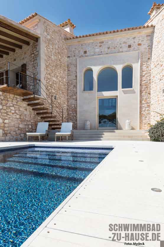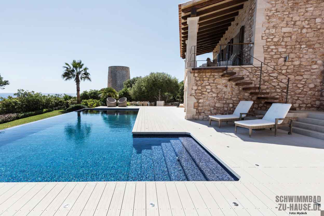 Poolbesitzer dieser mallorquinischen Region wählen häufig eine Poolumrandung aus Sandstein. Aufgrund der materialtypischen Vorteile zieht hier jedoch ein Bodenbelag in Form von Massivdielen alle Blicke auf sich. Die schlichten Dielen von Mydeck sind pflegeleicht und müssen nicht mehr jährlich abgeschliffen oder imprägniert werden. Weitere Pluspunkte: Sie sind salz- und chlorwasserresistent und fühlen sich auch barfuß angenehm an. Anders als Fliesen verströmen sie eine wohnliche Atmosphäre.