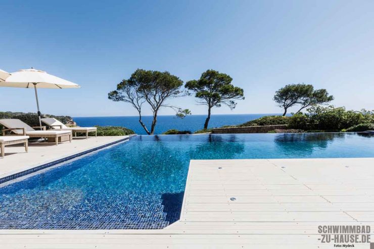 Lange überlegte das Ehepaar vor dem Bau der Wellnessoase vor einigen Jahren, welche Farbe die Fliesen bekommen sollten. Zunächst liebäugelte man mit Türkis, entschied sich schließlich aber für tiefblaue Mosaiksteine. Diese greifen die Farbe des Meeres auf und ergänzen so den Blick von der Terrasse über den Rand des Infinity-Pools hinweg auf das dahinter liegende Meer. Die Gestaltungsidee, die dem harmonischen Ensemble aus Terrasse, Poolumrandung und Schwimmbecken zugrunde liegt, war „Ton-in-Ton“. Unter Verwendung verschiedener Materialien entstand so eine Wohlfühloase der Extraklasse für Groß und Klein.