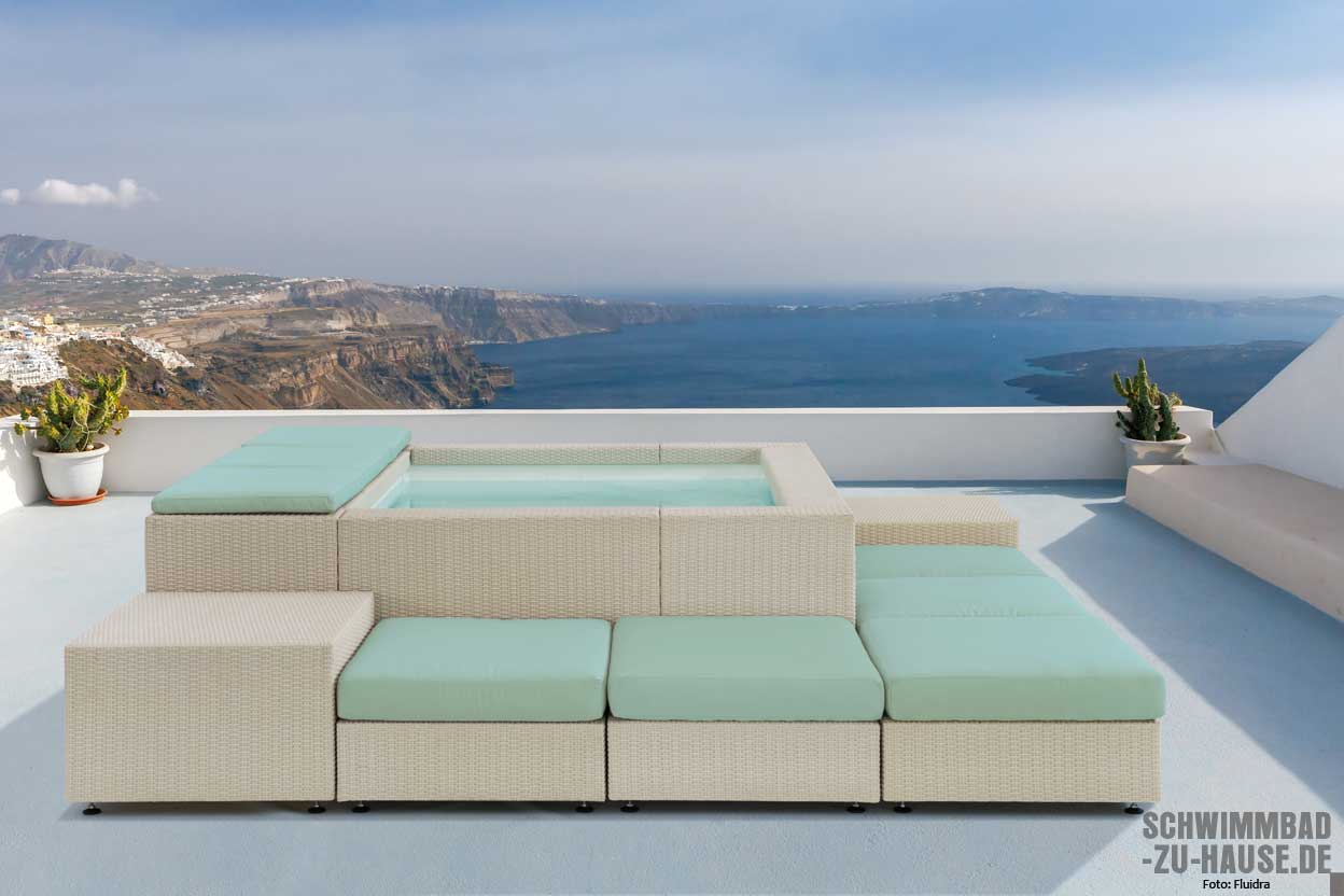 Die BWT Pool Products GmbH hat zwei Mini-Pools im Sortiment, die nur 3 Meter mal 0,76 Meter beziehungsweise 3,66 Meter mal 0,91 Meter groß sind. Sie besitzen eine integrierte Kartuschenfilteranlage, sind günstig im Preis und lassen sich schnell aufstellen. Einzig der Wulst muss aufgeblasen und das Wasser eingefüllt werden, bevor das private Badevergnügen zum Genießen einlädt. Gleiches gilt auch für die „Playa“-Reihe von Fluidra. In verschiedenen Größen erhältlichen Mini-Pools können an einem Tag aufgestellt werden, da keine Bodenarbeiten notwendig sind. Zudem sind die Becken reversibel, was bedeutet, dass die Pools auf Wunsch auch nur temporär im Sommer eingesetzt und im Winter einfach „verräumt“ werden können. Besonders beliebt ist das „Playa 2“ mit 3,2 mal 2,2 Metern, welches fast immer mit Whirl-Funktion und Beheizung bestellt wird. Beliebt sind zudem Polsterelemente aus der „Living“-Serie, die mit dem Mini-Pool kombiniert werden können und eine individuelle Gestaltung der eigenen Genuss- und Pool-Oase möglich machen.