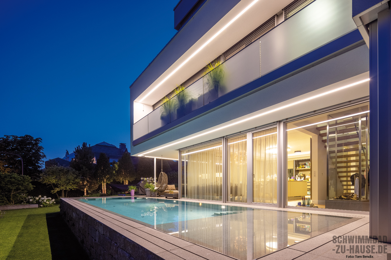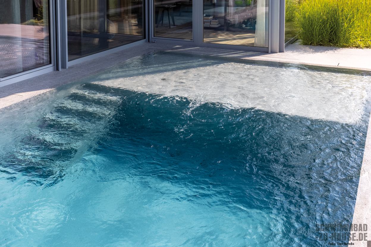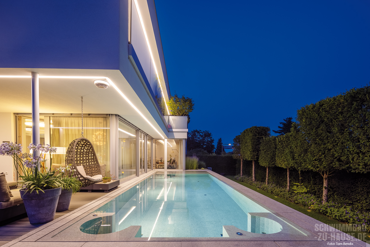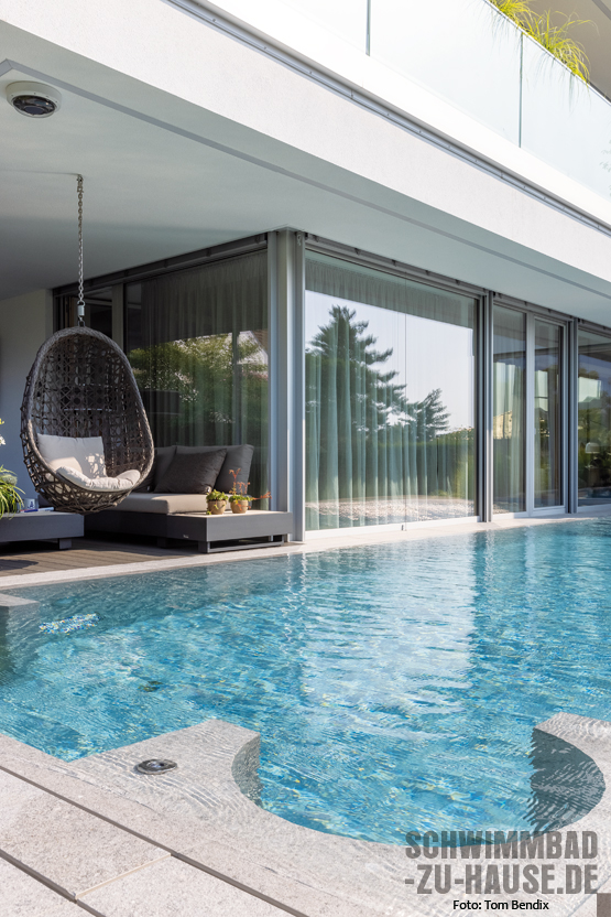 Trotz aller Hürden war das Vorhaben bis zum angegebenen Stichtag abgeschlossen. Beim Endergebnis sticht ganz besonders die gelungene Optik hervor, die perfekt zum Haus passt. Über eine Flachwasserzone gelangt man direkt aus dem Wohnzimmer ins Becken, das nun über die neueste Filtertechnik verfügt. Umlaufende Massagedüsen in den Stehnischen und ein Bodenquell zur Fußmassage liefern Entspannung. Eine ausgeklügelte Beleuchtung schafft gerade in den Abendstunden eine heimelige Atmosphäre, dazu zeigt das ausgefallene Mobiliar wie der Schaukelhängesessel den ganz besonderen Charakter des Außenbereichs.