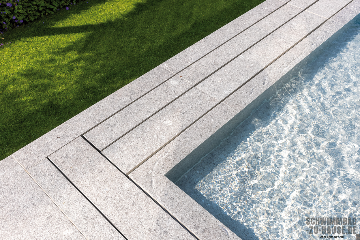 Der Auftraggeber dieses Projekts im Bundesland Hessen hatte bereits einen Pool im Garten stehen. Das in die Jahre gekommene Skimmerbecken sollte jedoch einem moderneren Modell weichen, das den aktuellen Anforderungen des Bauherrn eher Rechnung tragen sollte. Aufgrund der Lage, direkt an der Fensterfront des Hauses, empfahl der zuständige Schwimmbadprofi Florian Weerts von Weerts Pool & Spa den Einbau eines Rinnenbeckens, was beim Hausherrn auf Zuspruch stieß. Weitere Wünsche waren eine Oberfläche aus Kunst- oder Naturstein sowie zwei Massagenischen im Pool, von denen aus man auf dem Fernseher Fußballspiele genießen kann, der auf der