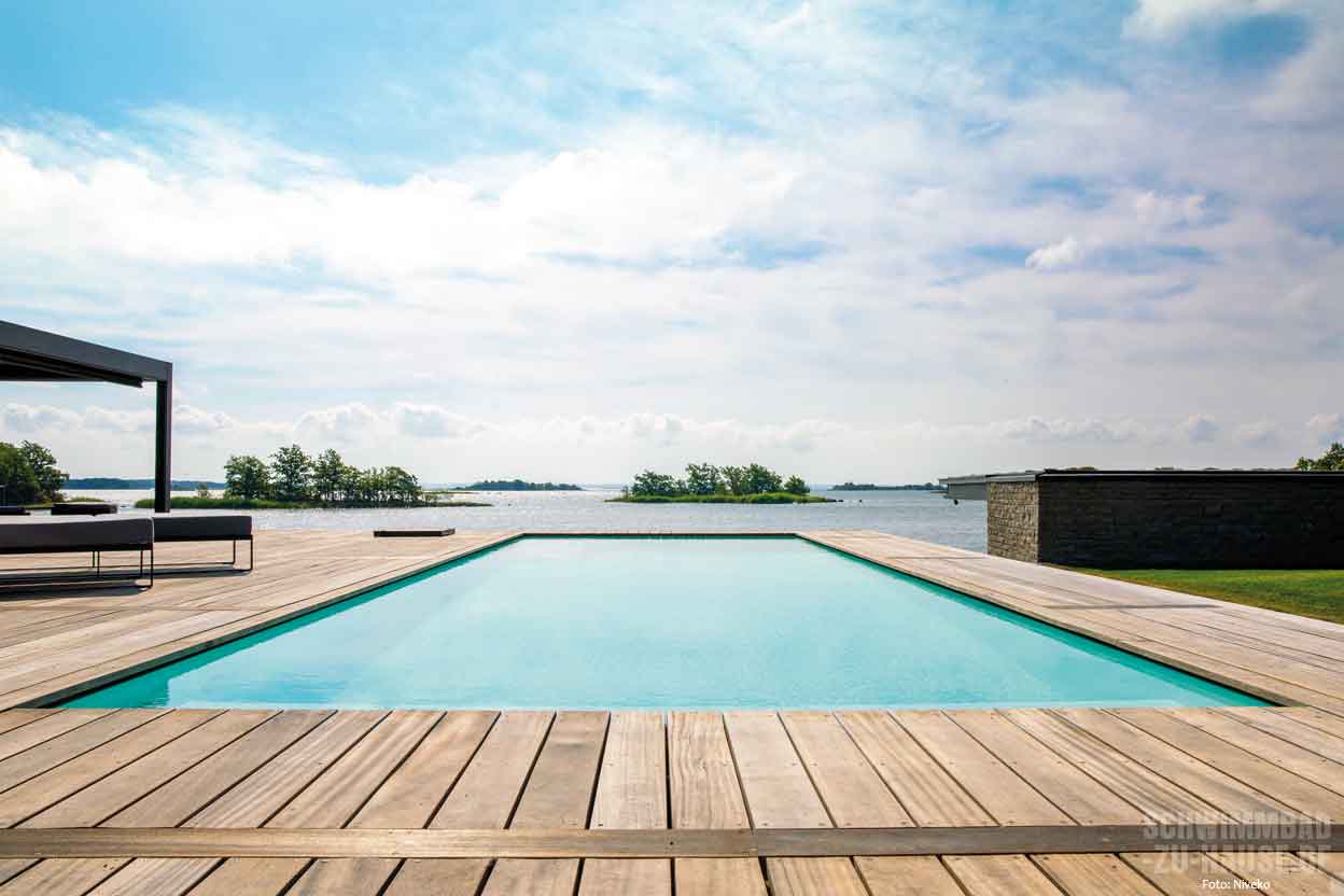 Das Becken „Underflow“ von Niveko ist ein Designschmuckstück. Hier scheint es, als ob der Wasserstand unter dem Terrassenrand verschwindet. So entsteht eine einmalige Optik und das Überlaufbecken wird eins mit der Umgebung.