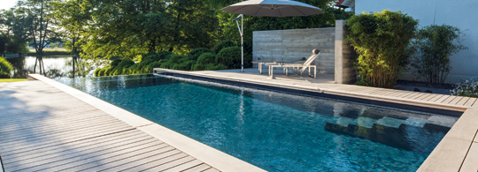 So sieht Erholung aus: Der Pool glitzert in der Sonne, das Wasser ist ruhig. Die Natur und die Stille am Becken lassen die Gedanken zur Ruhe kommen.