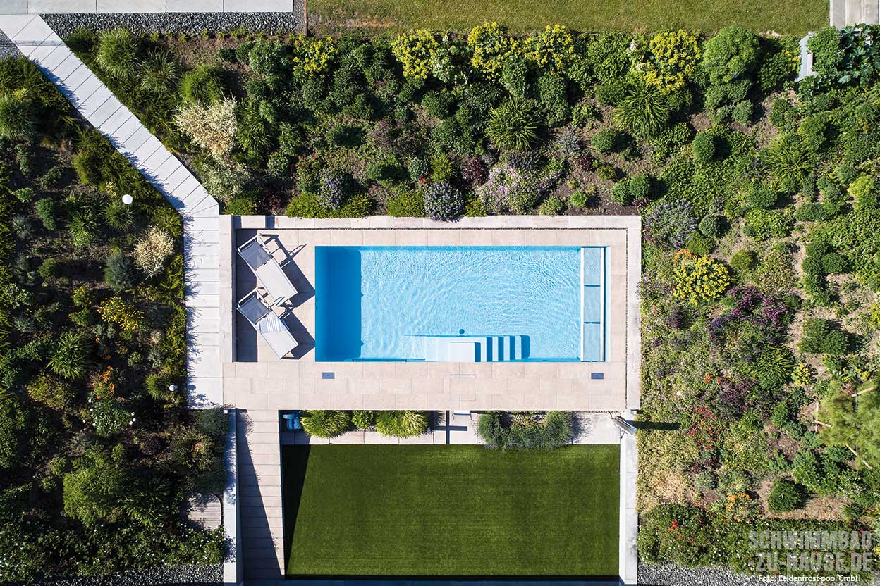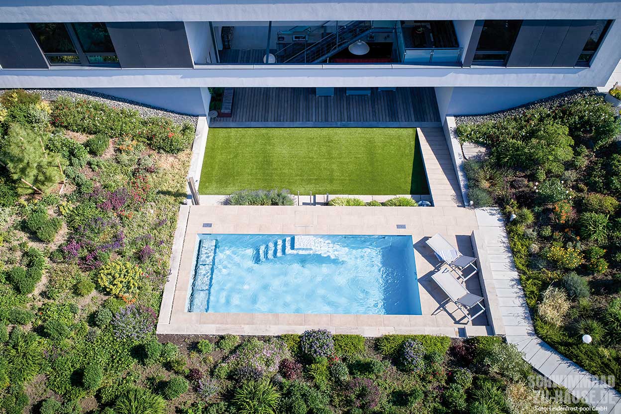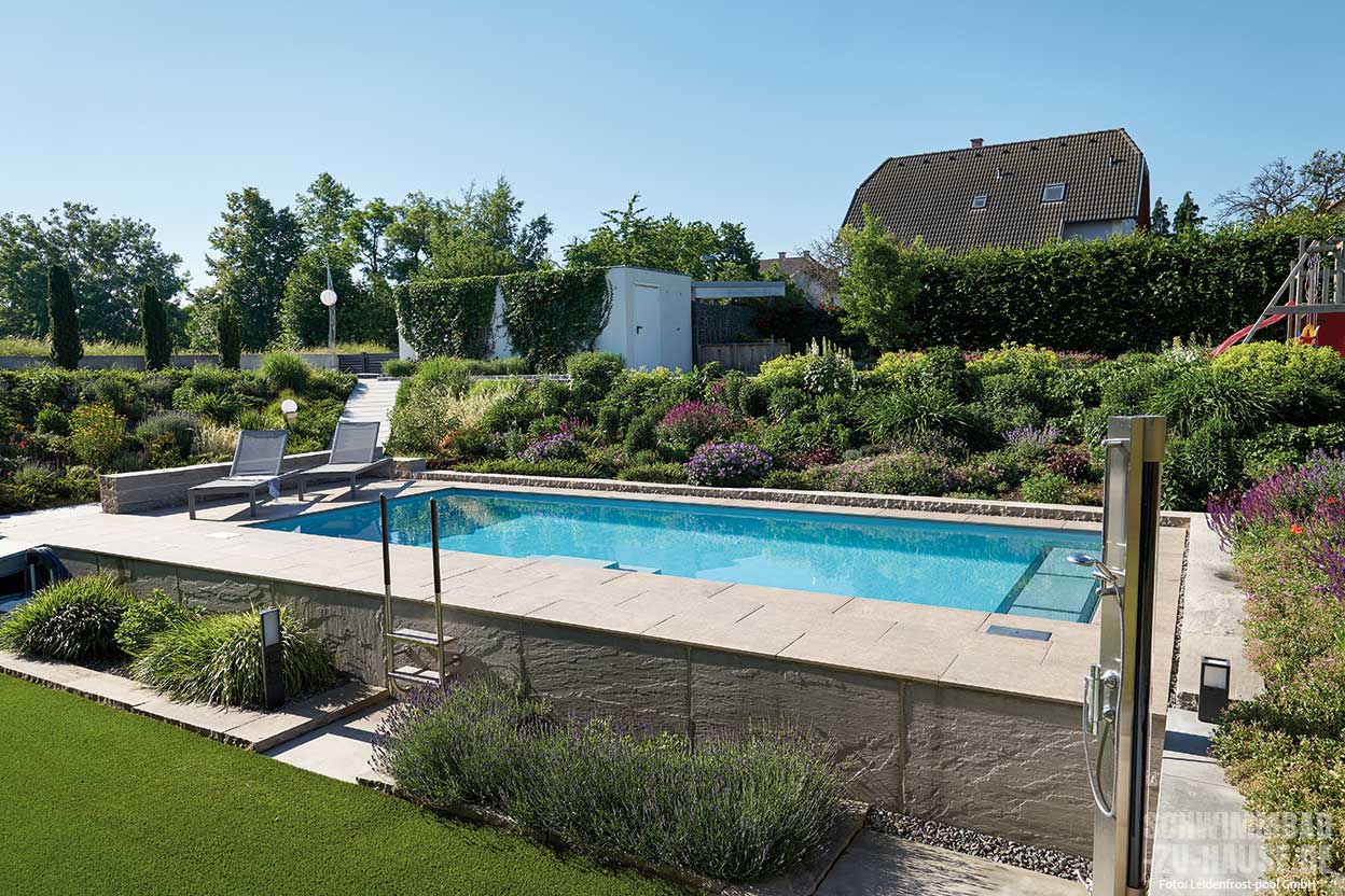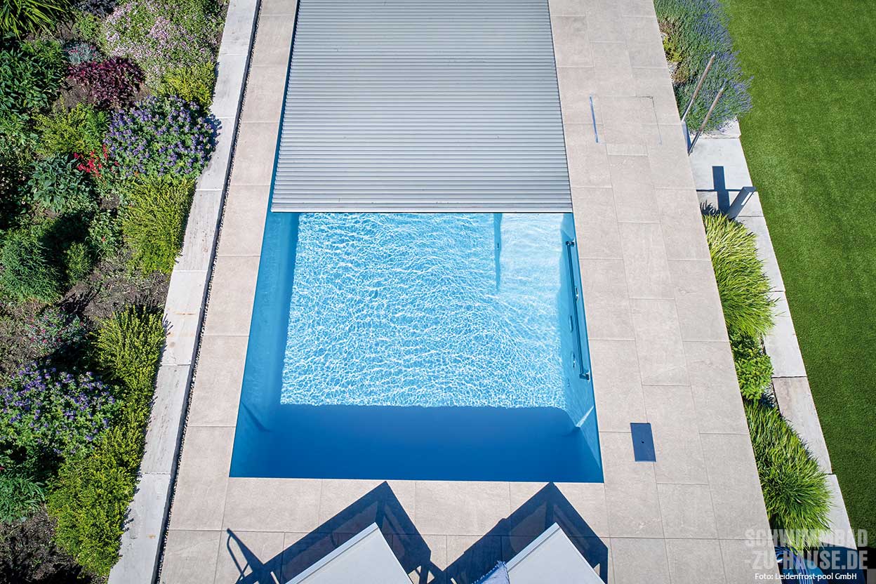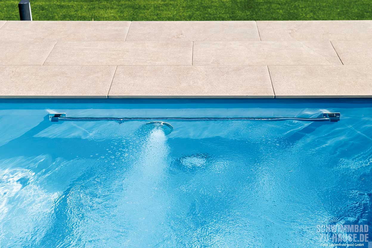 Während des Badebetriebs versteckt sich der Lamellen-Rollladen in der praktischen Unterwassersitzbank „Stone“, deren hochwertige Ausführung aus Feinsteinzeug und Edelstahl eine edle Sitzgelegenheit bietet. Hier können die Hausherren wunderbar im Wasser relaxen und den Blick in ihren üppig bepflanzten Garten genießen. Das „Top Waterline System“ von Leidenfrost (Leipo TWS) ermöglicht einen maximal hohen Wasserstand und lässt die Umgebung scheinbar bis an den Poolrand rücken.