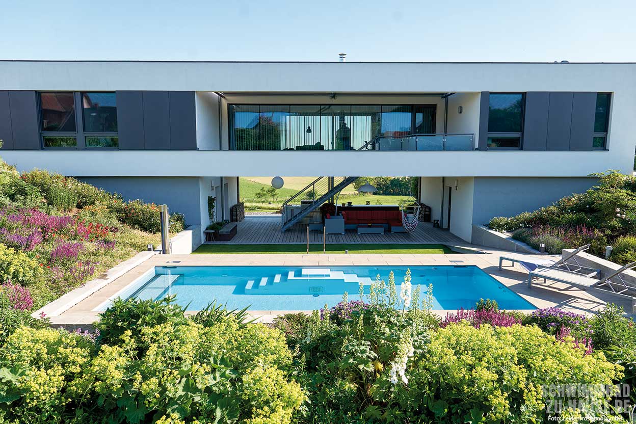 Sportliches Schwimmen, Entspannung und Training durch Massage- und Gegenstromanlage, Sonnenbaden am Pool sowie Relaxen in der schattigen Chill-out-Zone mit Essplatz und Outdoorküche: Im Außenbereich kann das Ehepaar mit seinen beiden Kleinen das Leben so richtig genießen. Dabei schafft die vom Haus überdeckte Terrasse eine harmonische Verbindung zwischen Garten und Gebäude.