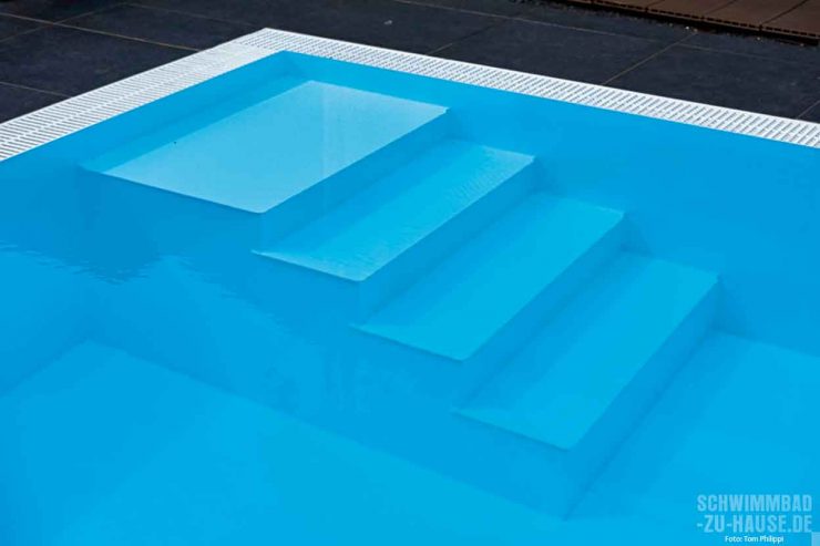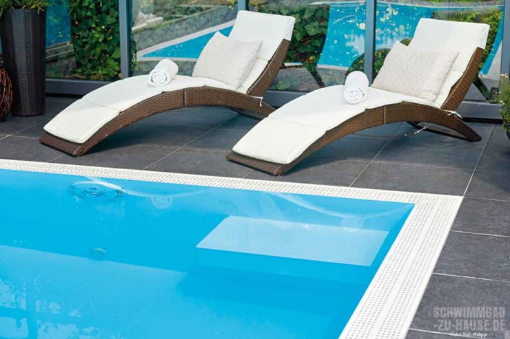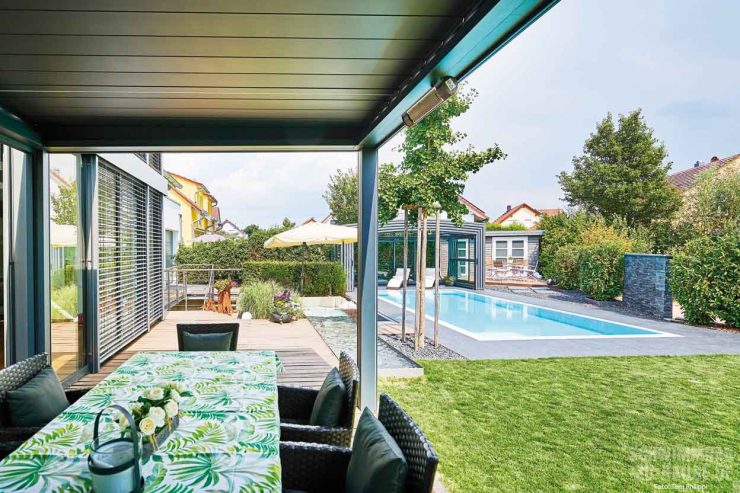 Ebenso hohe Ansprüche wie an das Becken und die optisch harmonische Einbindung in das Gesamtkonzept des Gartens hatte Achim Breitner an die technischen Komponenten des neuen Badeparadieses. Gemeinsam mit dem Schwimmbadbauer Christian Augel entschied man sich für die Wasseraufbereitung via Hydrolyse, bei der kein unangenehmer Chlorgeruch entsteht und nur wenig Salz eingesetzt werden muss. Des Weiteren sorgt eine Wärmepumpe von Midas für angenehm temperiertes Wasser. Übrigens: Durch die hohe Poolüberdachung „Rimini“ im XL-Format von Paradiso, die bei Nichtbenutzung oder an kühleren Tagen einfach über das Badewasser geschoben wird, verlängert die Familie die Badesaison, verhindert Verschmutzungen des Wassers und beugt Wärmeverlusten vor. Dank des „Quatro“-Führungssystems fährt die Überdachung auf Leichtlaufrädern und komplett ohne Bodenschienen. In Kombination mit einer innovativen Poolsteuerung, die per Wi-Fi über das Smartphone steuerbar ist, hat Achim Breitner stets alle Werte im Blick. „So hält sich der Zeitaufwand für die Poolpflege in Grenzen, ich kann mich entspannt zurücklehnen und meine Freizeit im Garten am Pool genießen“, schwärmt der Bauherr von seiner eigenen Wellnessoase.