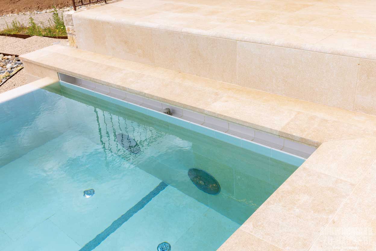 Ein Highlight ist der Whirlpool, der sich mittig an der langen Seite des Beckens befindet. „Seitlich wurde ein Jacuzzi mit Sitzbänken und zusätzlichen Massagedüsen integriert“, verrät uns der Bauherr. Hier kann man nach einem intensiven Training entspannen und die wohltuende Massage der Düsen genießen. Die einseitige Überlaufkante verleiht dem Pool eine moderne, elegante Note und bietet gleichzeitig einen atemberaubenden Blick auf die umliegende Landschaft. Andreas schwärmt: „Stehend kann hier auch einmal ein Cocktail getrunken werden.“