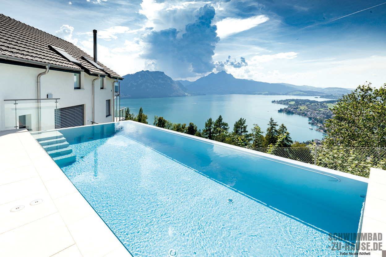 Eine Familie aus der Region hingegen hat hier ihr Wohnhaus und kann somit die imposante Szenerie ganzjährig auskosten. Den absoluten Glanzpunkt stellt dabei selbstverständlich der 8,50 Meter lange und 3,50 Meter breite Infinity-Pool dar, von dem aus sich ein beeindruckender Blick auf den See bietet.