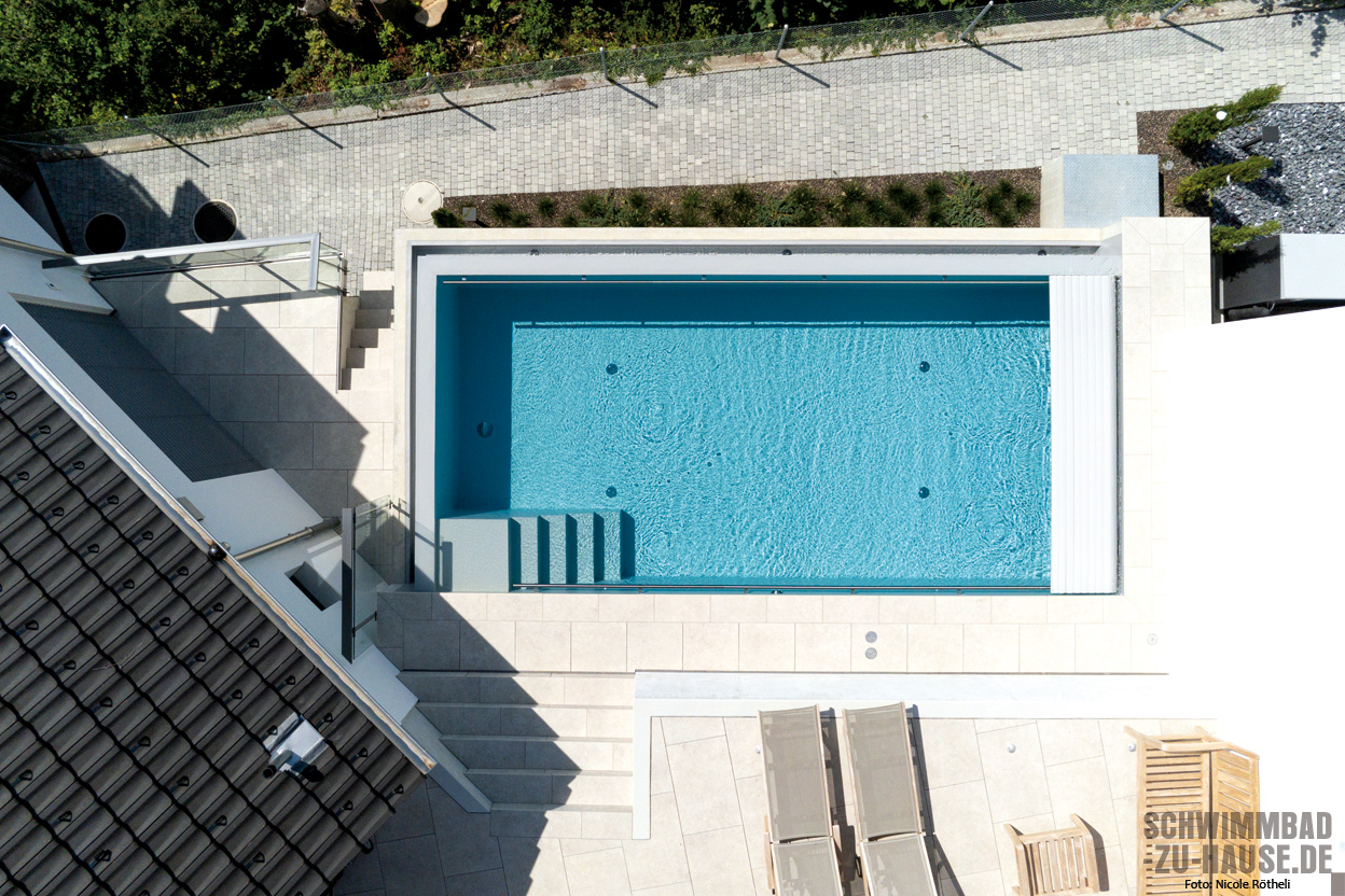 Die maßgeschneiderte Schwimmbadtechnik stellt auch die Software des Projekts ins Rampenlicht. Eine innovative Steuerung mitsamt automatischer Regelung der Wasserwerte und einem leicht zu bedienenden Touchscreen sorgen für einen minimalen Zeitaufwand bei der Poolpflege. Dank Photovoltaikanlage auf dem Garagendach und einer PVC-Rollladenabdeckung kommt auch der ökologische Faktor hier nicht zu kurz.