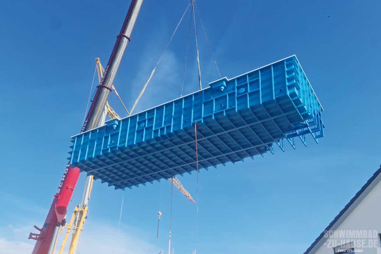 Was passiert nun nach dem erfolgreichen Transport des Beckens? Je nach Ausführung brauchen die Beckenkonstruktionen zusätzliche Hinterfüllung, meist durch Beton, oder sind durch statische Verstärkungen selbsttragend.