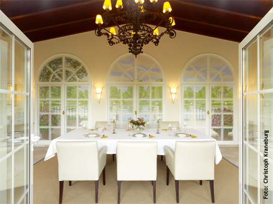 Fünf Jahre später klingelte das Telefon wieder: Der Geschäftsmann aus Frankfurt war erneut dran. Er habe sich eine große Orangerie bauen lassen. Und da die Gestaltung der Schwimmbad-Halle fünf Jahre zuvor so gut geklappt habe, bat er Hrubes, doch auch die neuen Räumen mit seiner Wandmalerei auszustatten. Hrubes malte drei große Fenster (als Abbilder der bereits real existierenden Fenster) hinter denen sich ein spannender Einblick in einen großen, privaten Park eröffnet. Blickt der Hausherr also nun auf seine Wand, wirkt es, als würde er aus einem Balkonfenster sehen – so realistisch sind die Malereien gelungen. Dreht sich der Besitzer dann um, blickt er wieder aus einem Fenster auf einen großen Garten. Dieses Mal handelt es sich aber nicht um Illusionsmalerei, sondern um den echten Garten. Und auch hier wiederholt sich das Motiv des Wassers. Im Garten des Anwesens befindet sich ein üppig dimensionierter Springbrunnen. Mit einer eigenen Wasseraufbereitungsanlage versehen, bildet er den Mittelpunkt des umbauten Gartens. Denn für den Hausherren ist Wellness mehr als nur eine schön gestaltete Schwimmbad-Halle. Das komplette Anwesen muss einen individuellen Wohlfühlcharakter haben, darf aber Bestandteil eines Entwicklungsprozesses sein.