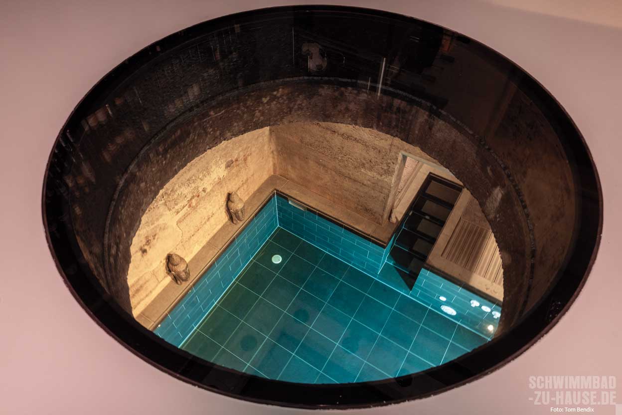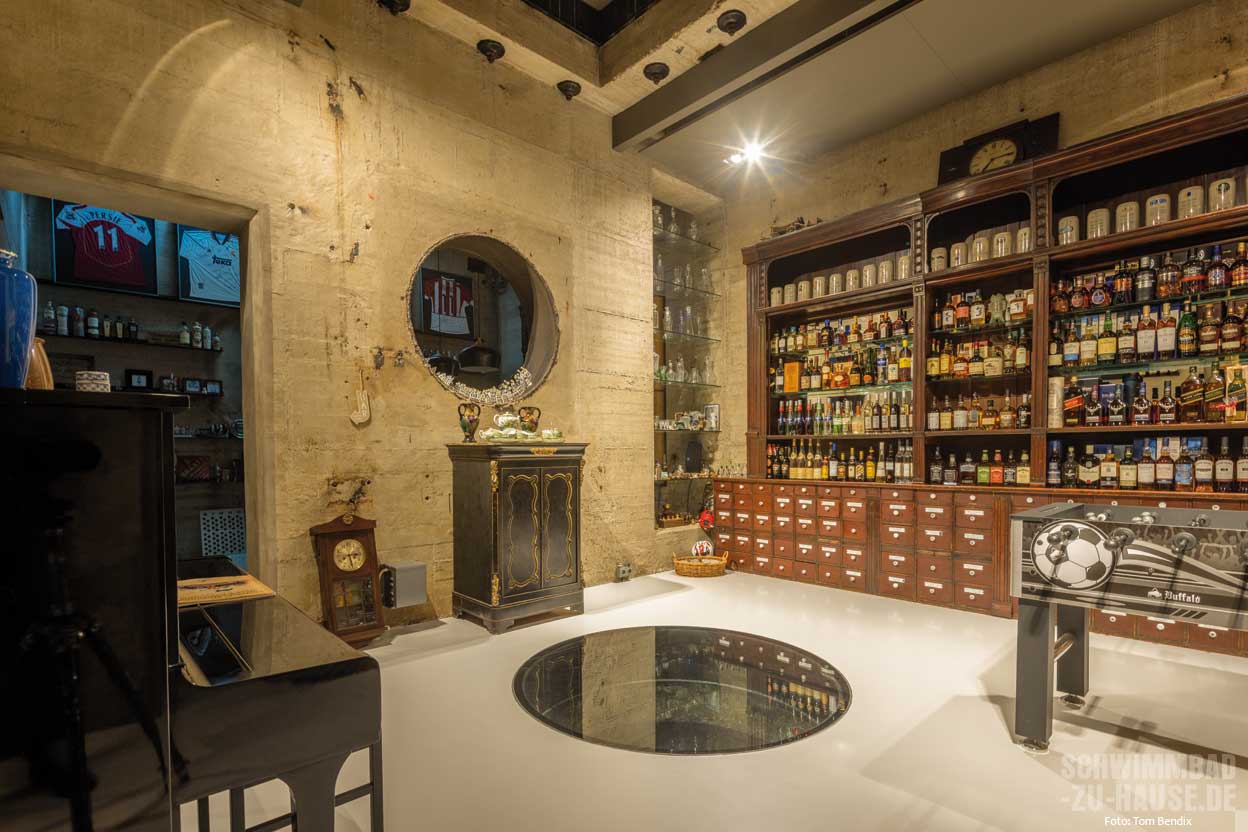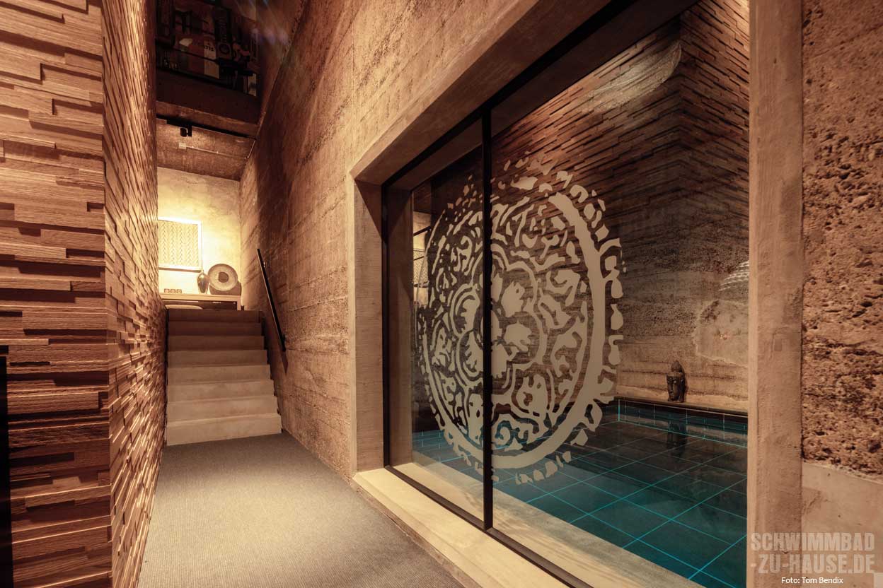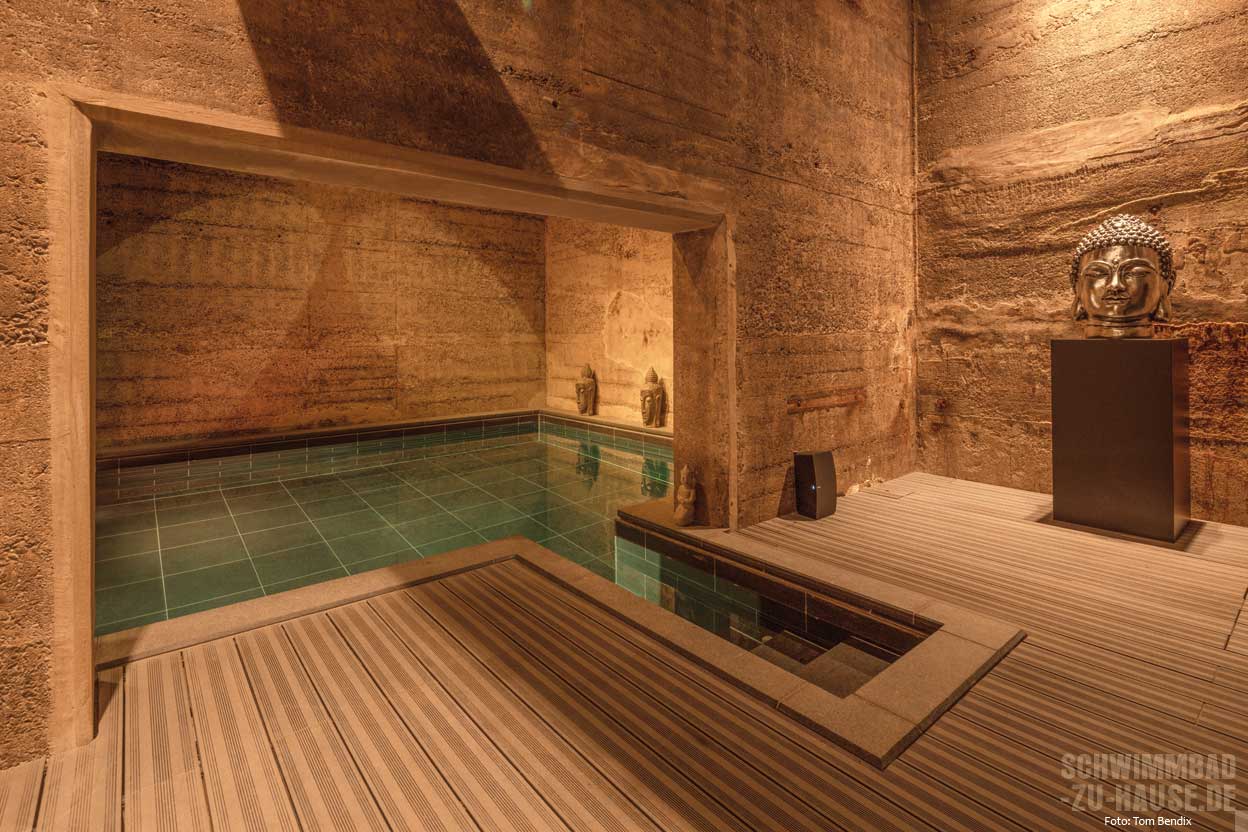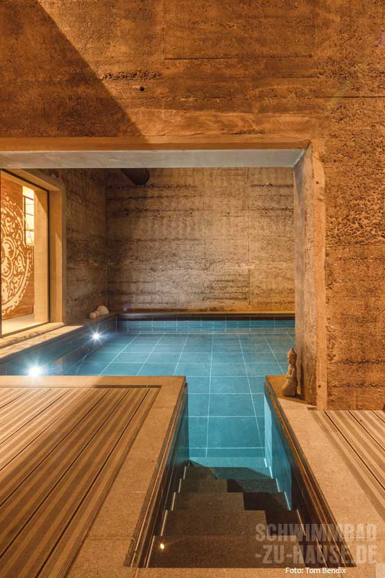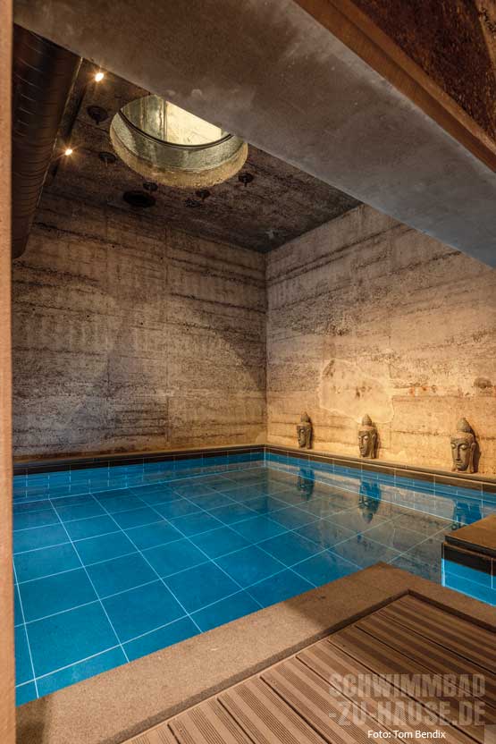 Ziel bei der Gestaltung der Wellnessoase war es, die unterirdischen Kellerräume so ursprünglich wie möglich zu erhalten, wobei die schöne Farbzeichnung der Betonkonstruktion durch die indirekte Beleuchtung sogar noch hervorgehoben wird. Licht fällt auch durch eine runde Öffnung in der Decke, wodurch der in einer rückwärtigen Nische gelegene Pool an eine mexikanische Cenote erinnert. Das Ambiente wirkt mystisch und geheimnisvoll, aber dennoch einladend. Warmes Wasser, sanftes Licht und beruhigende Hintergrundmusik machen das Entspannungserlebnis perfekt. Wer hier schwimmt, taucht zugleich in eine andere Welt ein.