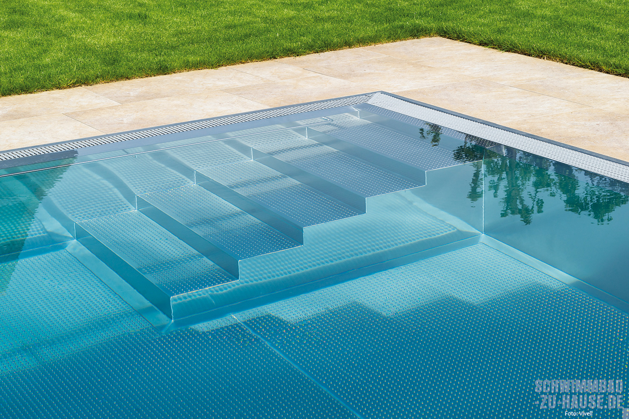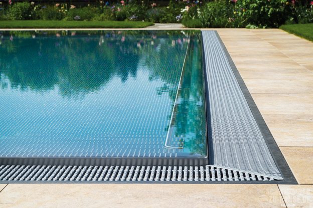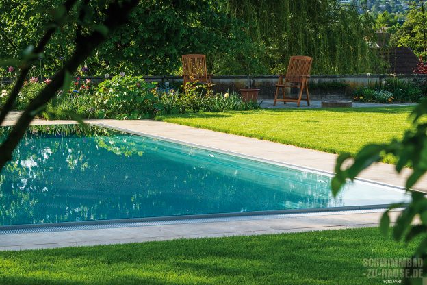 Der Materialmix ist puristisch, stilvoll und prächtig. Die vornehme Zurückhaltung und die klaren Formen verbinden sich zu einem geschmackvollen Ganzen. Betont wird die Form des langen eleganten Beckens noch durch die Überlaufrinne. Sie führt rings um das gesamte Becken und leitet überschwappendes Wasser zur Filteranlage und von dort, aufbereitet und quellfrisch, zurück ins Becken.