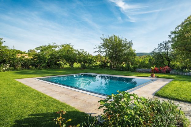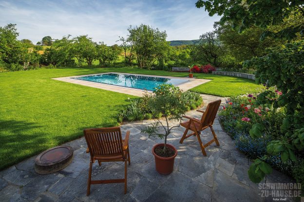 Es wirkt nach Urlaub ohne Ende, nach perfekter Rückzugsoase. Pool und Relaxzone präsentieren sich als stilvolles Ensemble mit einer geradezu berauschenden Geradlinigkeit und einem wohltuenden Weitblick ins Grüne. Das Edelstahlbecken misst imposante 11 x 5 Meter, hat eine Tiefe von 120 bis 140 Zentimeter und eine geschlossene Treppe mit fünf Tritten. Die klare Linie und die Harmonie zwischen Naturstein und Edelstahl wirken edel und einladend. Die Proportionen im und um den Pool sind stimmig und großzügig.