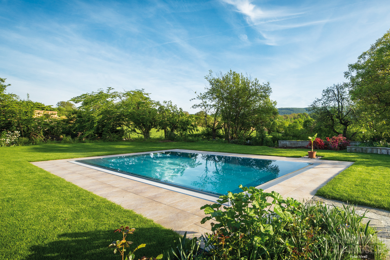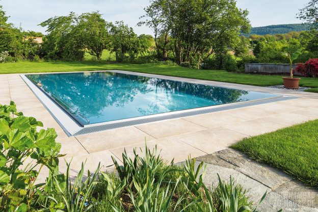 Der großzügige Außenpool in grüner Umgebung ist ganz aus Edelstahl gefertigt, einem der edelsten Baustoffe überhaupt, der durch seine kühle, schlichte Eleganz und seine außergewöhnliche Optik besticht . Das unverwüstliche Material bietet überzeugende Vorteile: Stahl ist beständig gegen Frost, Hitze und UV-Licht. Die glatten Oberflächen sind unter dem Gesichtspunkt der Hygiene