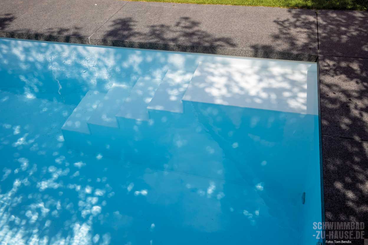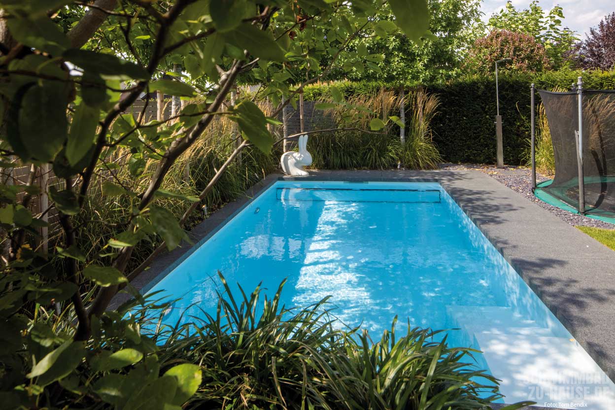 Im intensiven Austausch zwischen der Bauherrenfamilie und den Fachexperten von SSF. Pools by Klafs entstand ein Pool, welcher sich perfekt in die Gegebenheiten und Platzverhältnisse vor Ort einfügt. Um den begrenzten Platz ideal auszunutzen, entschied man sich für ein individuell gestaltetes, vorgefertigtes Kunststoffbecken mit schmaler Einstiegstreppe, die optimal im Pool platziert werden konnte. Das Schwimmbecken wird von einem Barfußbereich aus hellen Feinsteinzeugplatten umrahmt, welche auch bei heißen Außentemperaturen angenehm zu betreten sind. Der Rucksackrolladen des SSF „Pool One“ ist geschickt in einem Schacht unter der Steinumrahmung verbaut, um so die maximal mögliche Schwimmfläche zu haben. Die SSF Premium Technik wurde auf kleinstem Raum in einem zur Umgebung passenden Gartenhaus ganz in der Nähe des Pools untergebracht. Durch kurze Wege der Rohrleitungen wird damit der Energieverbrauch geringgehalten.