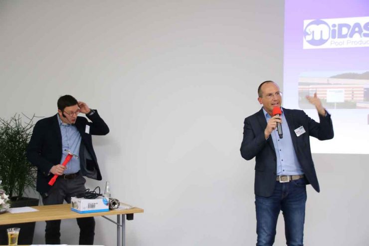 Am Morgen des 1. Dezember 2017 startete er, der 3. Techniktag von Midas. Es war ein klarer Wintertag und die Gipfel um das 3G Kompetenzzentrum mit angrenzendem Hotel nahe Fulda trugen den ersten Schnee. Über 100 Gäste aus Deutschland, Belgien, Luxemburg und Russland versammelten sich frisch, motiviert und ausgeschlafen um 9 Uhr in der Empfangshalle des Veranstaltungszentrums – alle gespannt auf die Produktneuheiten und Trends für die neue Poolsaison 2018. Schon hier begannen fachliche Gespräche und der rege Austausch unter den Schwimmbadprofis.