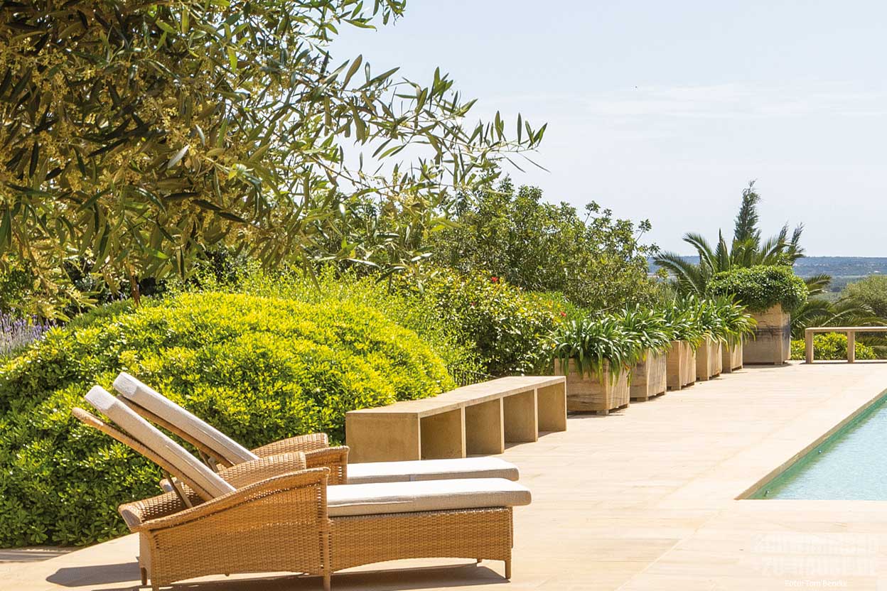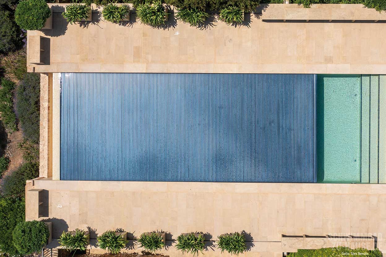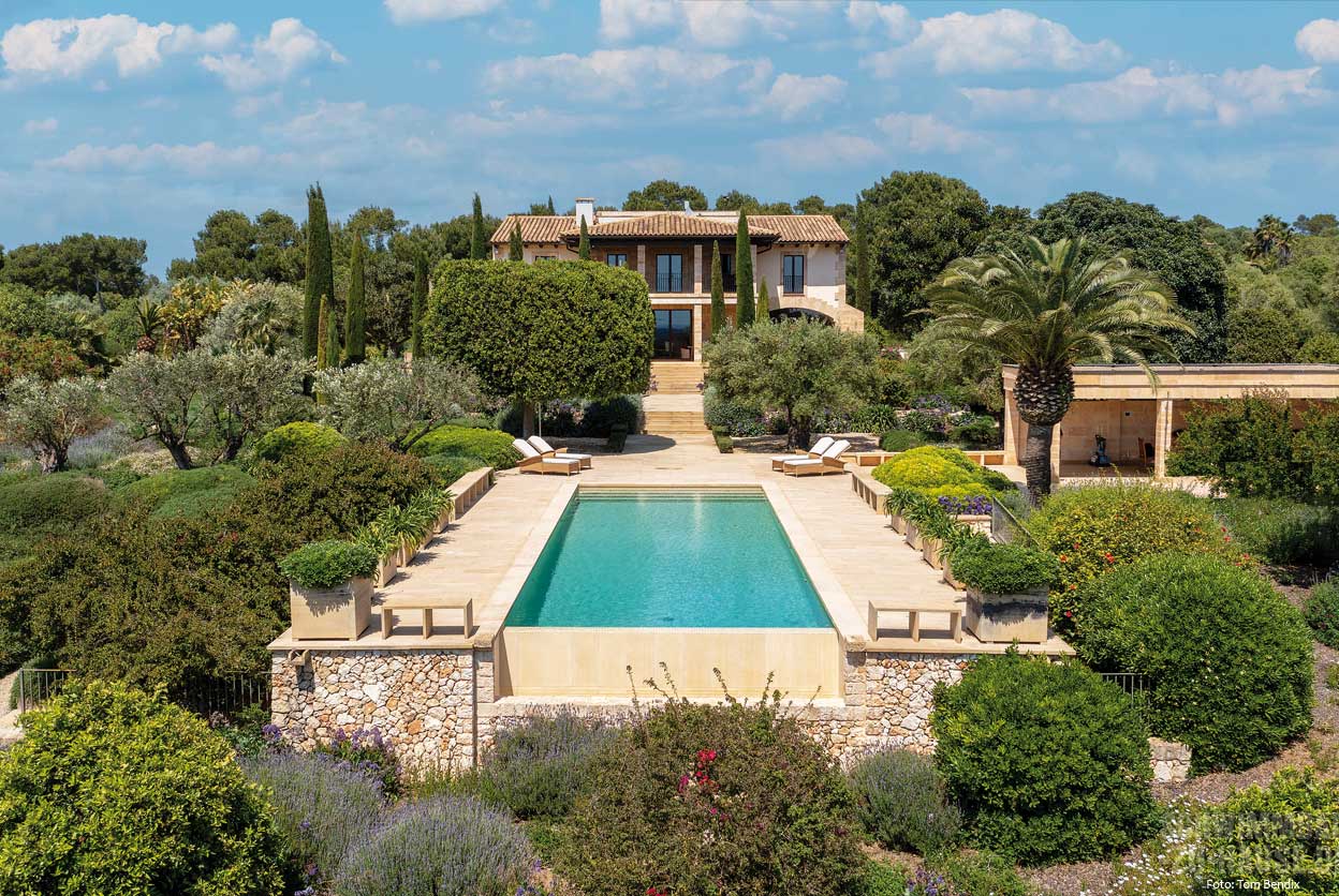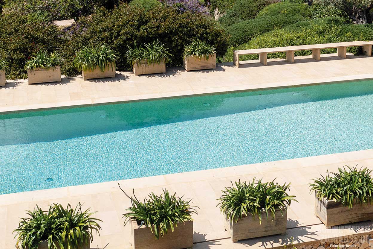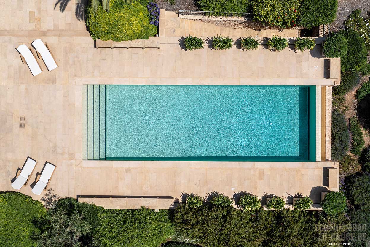 Helltürkis schimmerndes Wasser, großzügige Abmessungen, hochwertigste Schwimmbadtechnik und ein Überlauf mit außergewöhnlichem Infinity-Effekt: Dieses private Poolprojekt im Garten einer luxuriösen Villa in der mallorquinischen Gemeinde Santanyí hat alles, was das Wellness-Herz begehrt