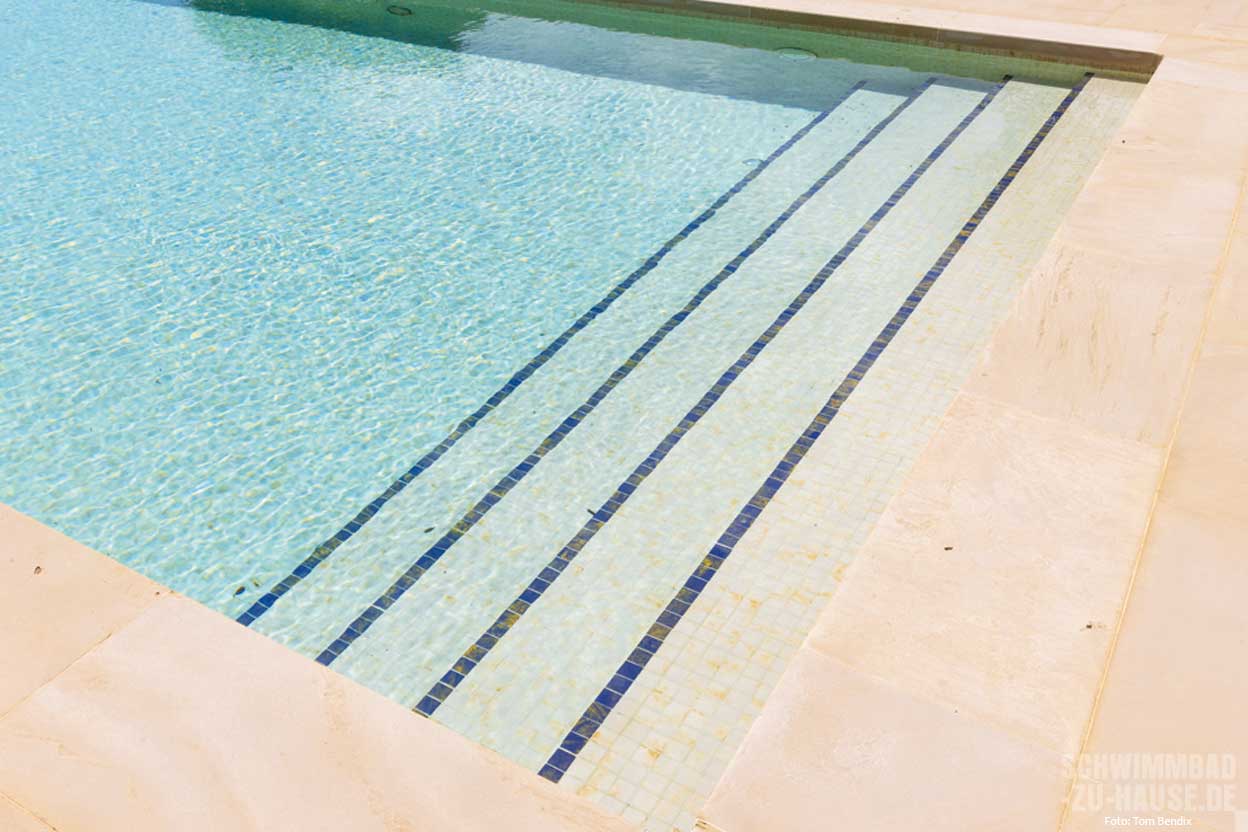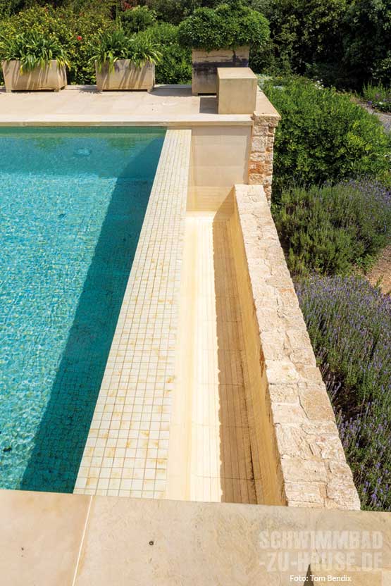 Mit seinen stattlichen Maßen von 5 x 15 Meter bietet das harmonisch in die Umgebung integrierte Betonbecken ausreichend Platz für das tägliche Schwimmtraining, Wasserspaß für die Kleinen und entspanntes Relaxen beispielsweise auf den breiten Einstiegsstufen. Ein optisches Highlight ist ohne Frage die Auskleidung des gesamten Beckens mit hochwertigen Mosaiksteinchen, die das Badewasser stimmungsvoll strahlen lassen und das Licht der Sonne auf einzigartige Weise reflektieren. Damit die Bauherren, die maßgeblich an der Gestaltung des Poolprojekts beteiligt und eigene Ideen beigesteuert haben, den atemberaubenden Ausblick ins Tal genießen können, verfügt das Schwimmbecken über eine Überlaufrinne, die einen besonders hohen Wasserstand und an der Stirnseite eine Infinity-Kante ermöglicht. So scheint es, als schwimme man direkt in die Natur.