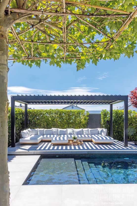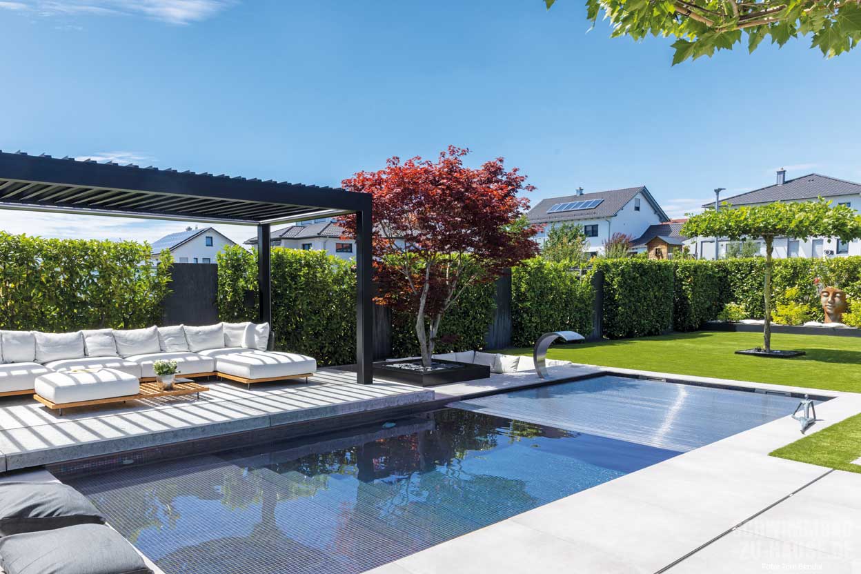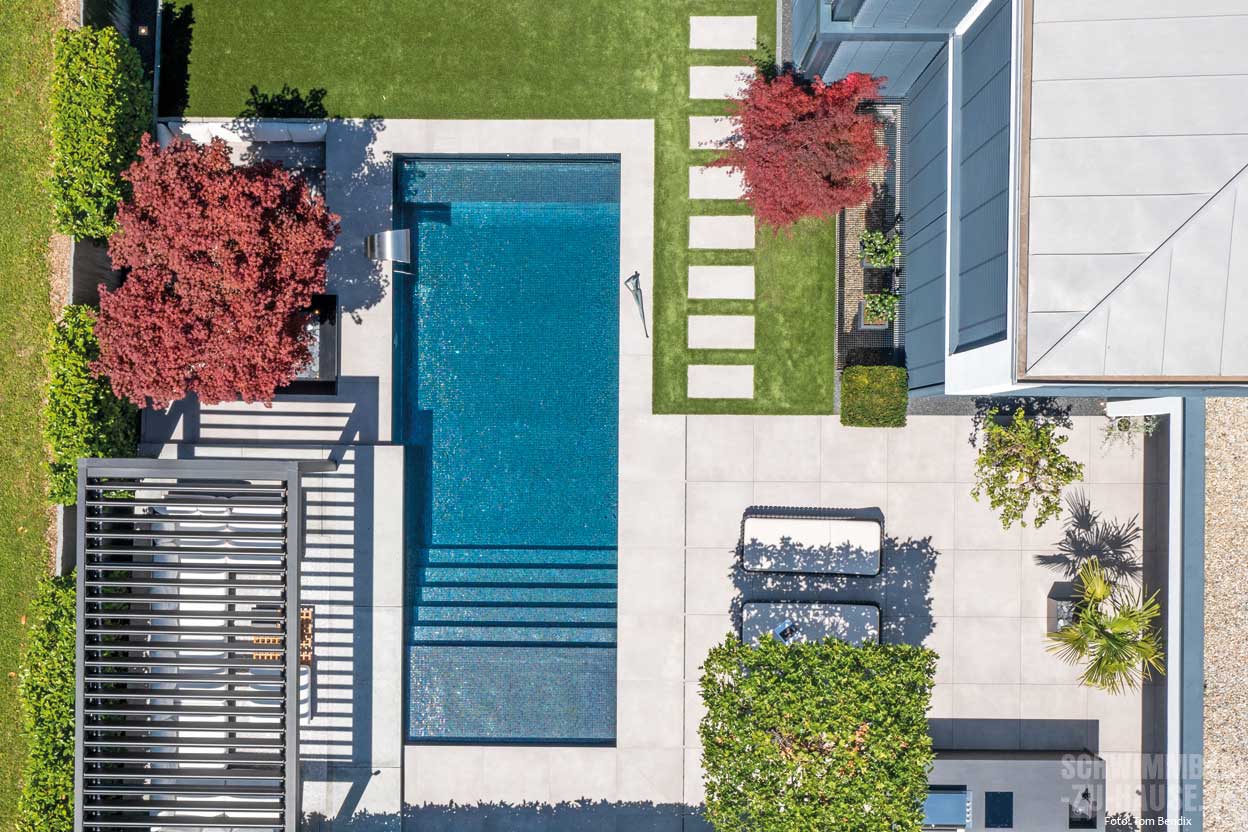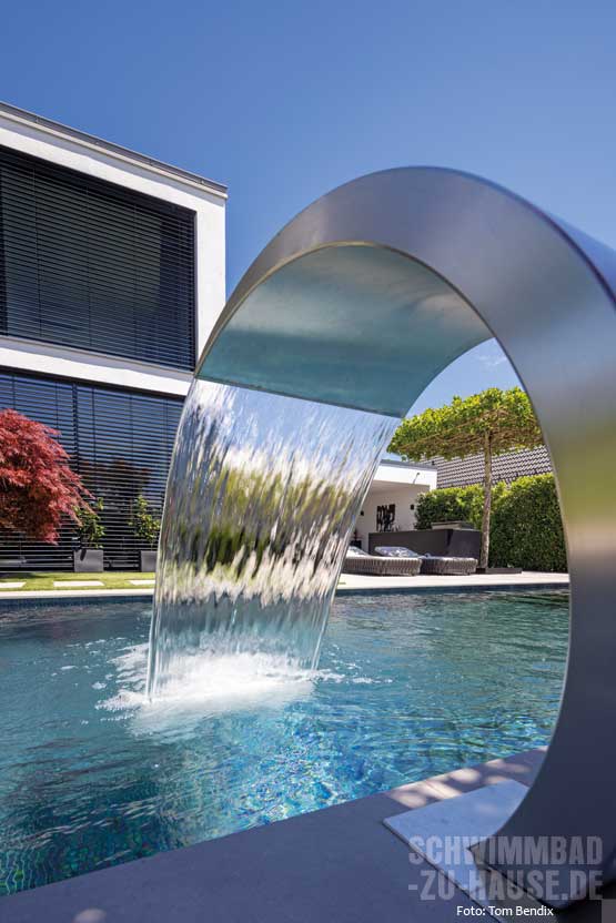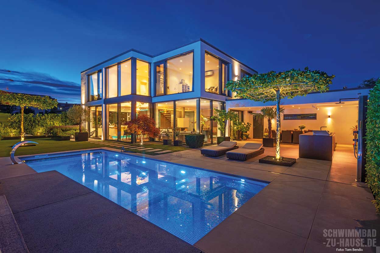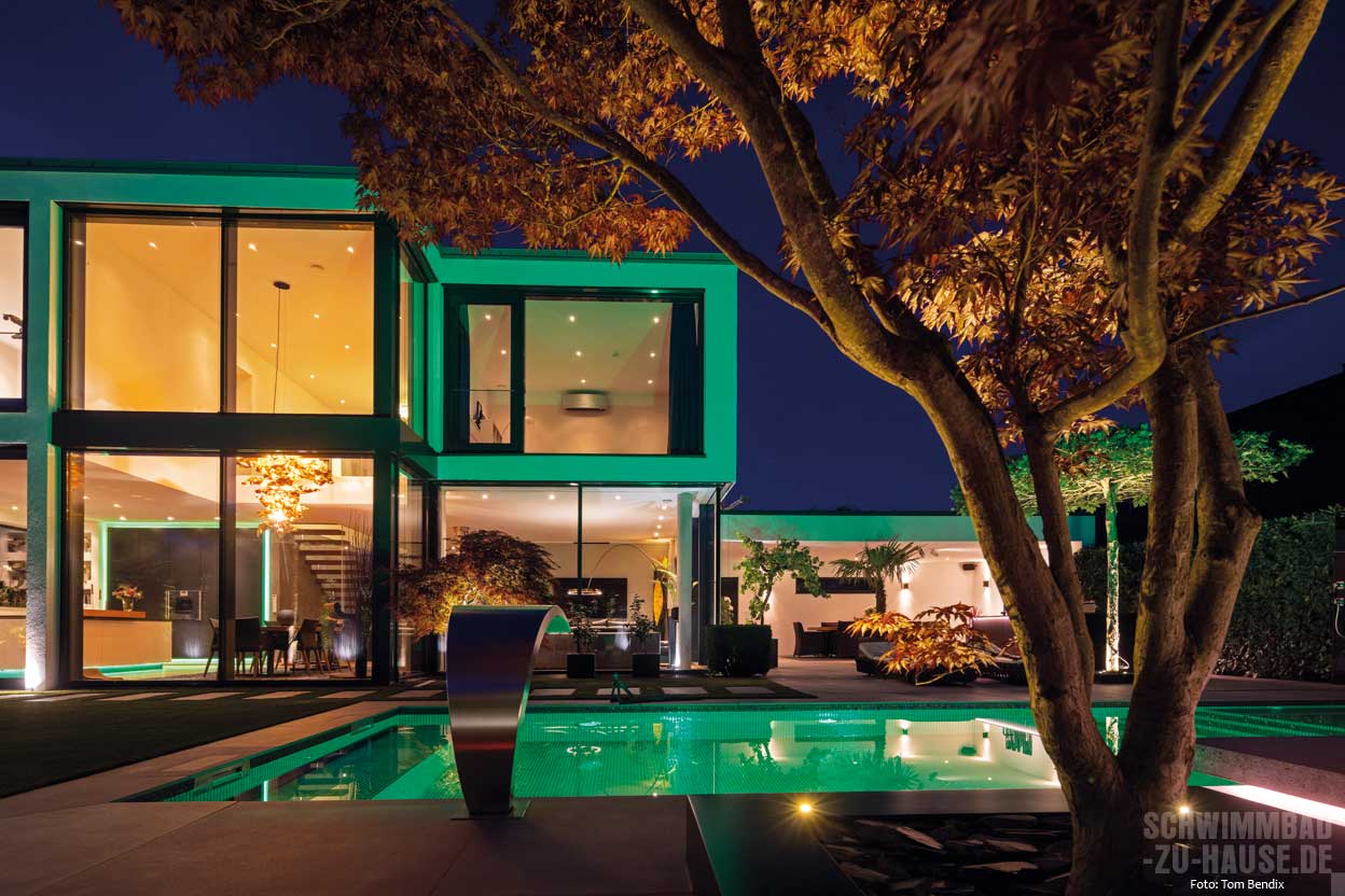 anlage sind zusammen mit den beiden Wasserspielelementen und der Schwalldusche eine echte Hinguckerkombi. Auch das Farbspiel der Mosaiksteine ist einfach beeindruckend. Besonders am Abend, wenn der Pool beleuchtet wird und sich der Sonnenuntergang in den Glasscheiben des Hauses spiegelt, entsteht eine magische Atmosphäre.