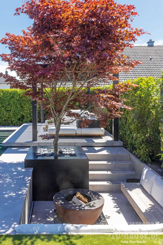 Schon beim Betreten des Gartens fühlt man sich wie in eine andere Welt versetzt. Die Kirschlorbeerhecke bildet einen natürlichen Sichtschutz und schafft eine wohnliche Atmosphäre. Die Schieferplatten, die zwischen den Heckenabschnitten stehen, verleihen dem Garten Struktur und Tiefe.