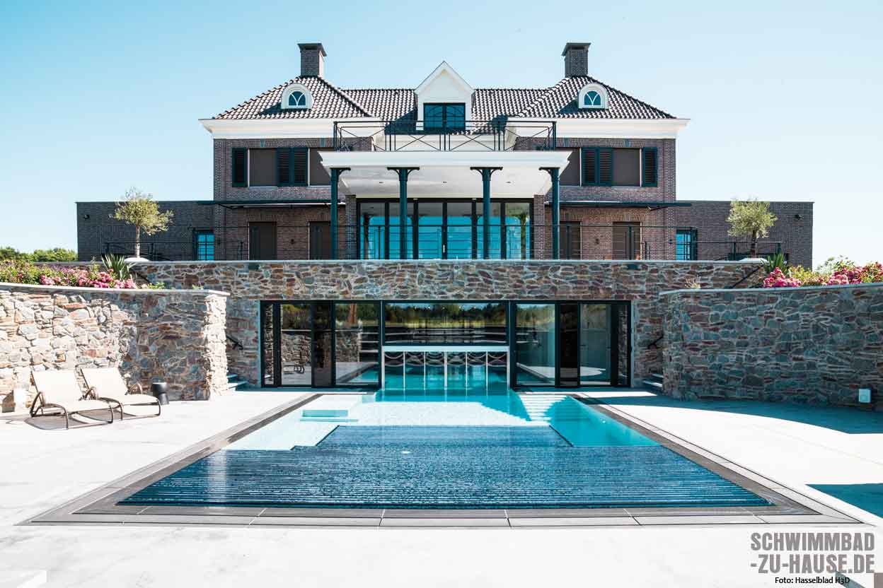 Dem Wunsch des Bauherrn nach möglichst geringen Energiekosten wurde mit einer Lamellenabdeckung von Swim Safe entsprochen. Sie sorgt nicht nur dafür, dass im Außenbereich die Wärme im Pool bleibt, sondern reduziert auch die Wasserverdunstung und den Einsatz von Chemikalien. Dank moderner Technik, hochwertiger Materialien und der harmonischen Verbindung von Wasser und Wohnen erfreut sich der im Investment-bereich tätige Hausbesitzer nun an einer exklusiven Wellnesswelt, die er 365 Tage im Jahr genießen kann.