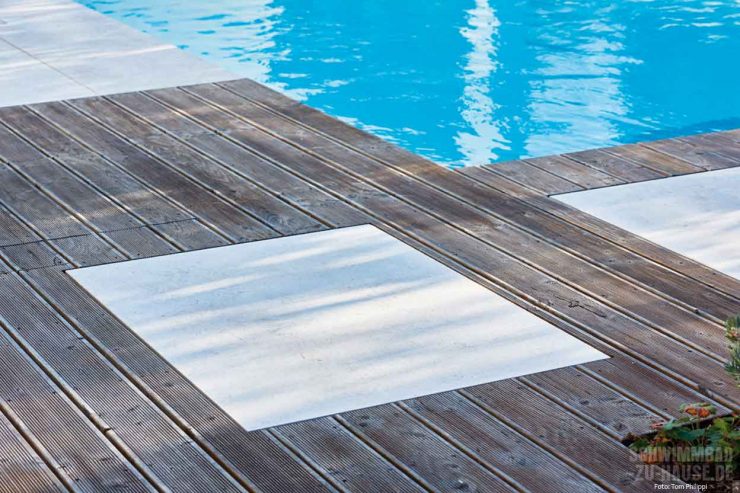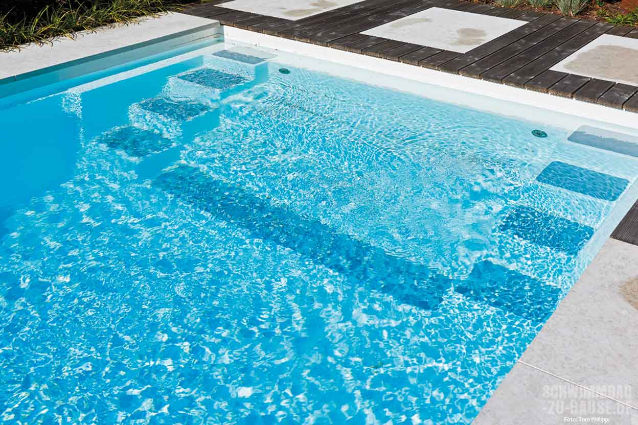 „Optische Hochwertigkeit, eine reibungslos arbeitende Pooltechnik und Komfort lagen dem Bauherren besonders am Herzen. Mit einem perfekt seinen Bedürfnissen angepasstem Gesamtkonzept für das Schwimmbad konnten wir dies garantieren“, skizziert Andreas Sorg die Vorstellung von Herrn Hoffmeier. Das Ergebnis kann sich sehen lassen: Eine Unterflurrollladenabdeckung an der Stirnseite des Beckens kann bei Nichtbentzung automatisch über die Wasseroberfläche gefahren werden. Dies schützt vor Verschmutzungen durch herabfallendes Laub oder Äste und spart zugleich Energiekosten. Weil der Rollladen die Wärme im Becken hält, wird die Heizung – in diesem Fall eine Wärmepumpe – entlastet. Komfortables Extra: Ist die Rollladenabdeckung eingefahren, dient der Schacht unter Wasser als bequeme Sitzbank, auf der man sich sonnen kann. Damit David Hoffmeier so wenig Zeit wie möglich mit der Wasserpflege verbringen muss, installierte das Team von Sorg ein ausgeklügeltes technisches Ensemble: Die Filteranlge „Topras Top 20“ garantiert jederzeit sauberes Wasser, während der „Pool-Manager“ von Bayrol Dosierung der Chemikalien und Steuerung der Technik übernimmt. „So benötige ich pro Woche lediglich 25 Minuten für die Pflege und kann mich die übrige Zeit zurücklehnen und den Pool genießen“, schwärmt David Hoffmeier.
