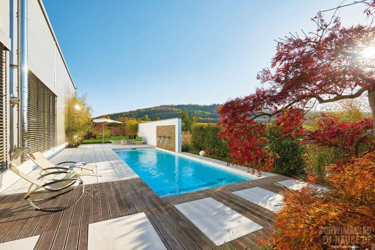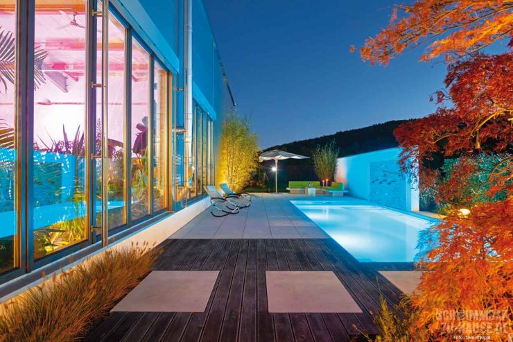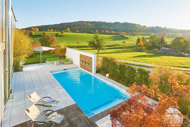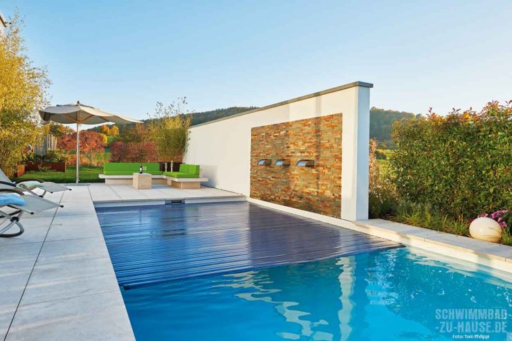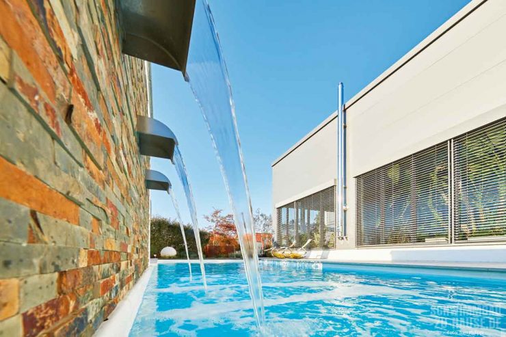 Da der Platz begrenzt war, entschied sich das Team für ein zeitlos-geradliniges Skimmer-Becken aus GFK mit den Maßen 9,45 x 3,70 x 1,50 Meter, das parallel zum Haus platziert ist. Eingerahmt wird das Schwimmbad durch die Poolumrandung aus großformatigen hellen Natursteinfliesen, die gleichzeitig als Sonnenterrasse dienen. Für optische Spannung und einen schönen Kontrast sorgt des Weiteren die Holzverkleidung der Terrasse am Einstiegsbereich des Beckens. Hier gelangen die Wasserfans sicher über die breite Treppe ins kühle Nass. Auf der gegenüberliegenden Stirnseite des Pools schützt eine raffiniert gestaltete Mauer vor unerwünschten Blicken auf die dahinter liegende Lounge-Area. Das in die Mauer integrierte Wasserspiel aus Wasserfällen, die direkt in den Pool münden, fasziniert und entspannt.