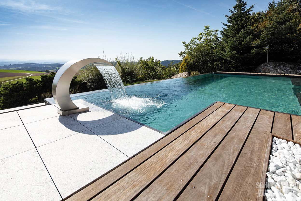 Wasserattraktionen wie Schaumdüsen im Treppen- und Liegebereich und eine Schwalldusche am verlängerten Beckenende setzen den Pool eindrucksvoll in Szene und machen ihn auch ohne Badebetrieb zu einem attraktiven Gestaltungselement. Boden und Trittflächen der Stufen sind mit Naturstein verkleidet, was die Exklusivität der Anlage unterstreicht. Ist der Unterflurrollladen ausgefahren und der Pool abgedeckt, wird der Überlauf deaktiviert und mit einer Nachtabsenkungspumpe mit geringerem Stromverbrauch filtriert. Das hilft neben der Wärme-