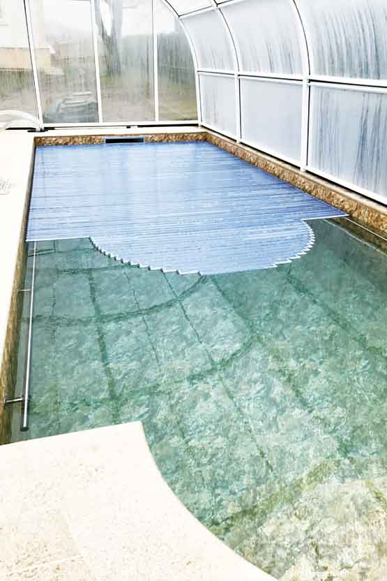 Ein Hallenbad ist ein ganz besonderes Projekt. Aufgrund der hohen Raumtemperatur und Luftfeuchtigkeit sind einige Vorkehrungen zu treffen, um nicht nur eine energieeffiziente Betreibung sicherzustellen, sondern auch Schäden an der Bausubstanz vorzubeugen. Ein Klimagerät und eine Dampfsperre sind unerlässlich und sollten individuell mit Planer, Architekt und Schwimmbadbauer ausgewählt werden. Eine zusätzliche Rollladenabdeckung hilft, die Betriebskosten geringer zu halten und senkt zudem die Luftfeuchtigkeit in der Schwimmhalle.