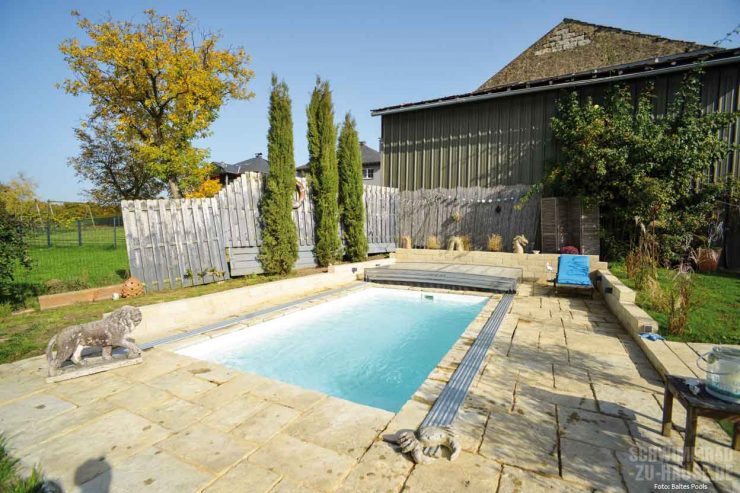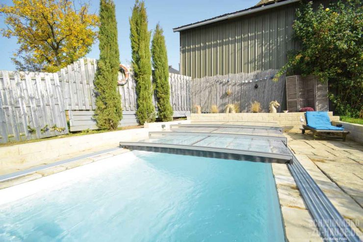 Eine wesentliche Frage bezieht sich auf die Nutzungsdauer eines Pools. Unabhängig davon, ob als sommerlich erfrischender Badespaß oder Nutzung von Frühjahr bis in den späten Herbst oder gar ein Betrieb an 365 Tagen im Jahr: Niemand möchte im eiskalten Wasser baden. Darum gilt es, eine effiziente Poolheizung vorzuhalten und gleichzeitig den Energieverlust zu minimieren. Im gezeigten Beispiel wird der Wärmeverlust des Pools durch die hochwertige und dicht abschließende Schiebeüberdachung von Topras minimiert. Gleichzeitig sorgt eine hochwärmedämmende Pooltec-Hinterfüllung des Pools für optimale Wärmedämmung. In Verbindung mit der funktionalen Wärmepumpe ist somit ein kostengünstiges Warmbade-Vergnügen bis zu den ersten Nachtfrösten garantiert.