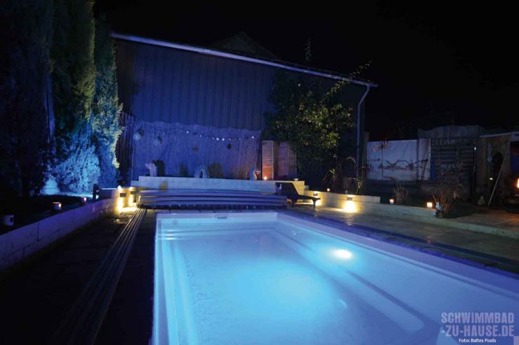 Das Becken „Topras Selene 550“ ist mit farbigen RGB-LED Unterwasserscheinwerfern, Filteranlage, Salzwasserhydrolyse- und einer Poolwasserwärmepumpe ausgestattet und erlaubt in Verbindung mit der hochwertigen flachen Schiebabdeckung einen sogenannten Drei-Jahreszeiten-Betrieb: Im Winter dient der Pool als Tauchbecken für die nahe gelegene Sauna. Die Pooltechnik ist dezent in der angrenzenden rückwärtigen Maschinenhalle untergebracht.