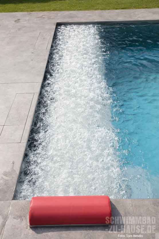 Mit der „Hydrostar“ von Binder ist der Familienvater zweier Kinder jetzt mehr als glücklich. Die „Hydrostar“-Turbine erzeugt eine breite, gleichmäßige Strömung mit der nötigen Gegenkraft für endloses Schwimmen, das auch Profisportler richtig fordert. Die Strömung erfasst dabei den ganzen Körper und trägt ihn im Wasser. Besonders praktisch ist in diesem Zusammenhang, dass man auf dem Touch-Display individuelle Trainingsprogramme für Kinder und Eltern erstellen kann. Nach dem Sport lockt der sich an der Stirnseite des Beckens befindende Flachwasserbereich zur Entspannung. Denn hier integrierte Hydromassagedüsen verwöhnen beanspruchte Muskeln.