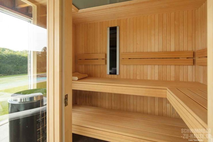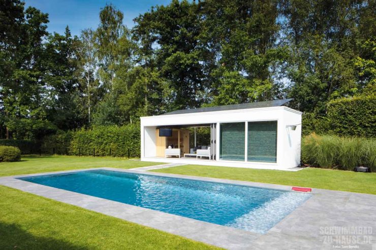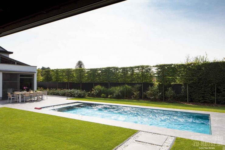 „Ich habe den Bauherren zur Inspiration Bilder bereits umgesetzter Schwimmbadanlagen gezeigt, um die optische Gestaltung dieses Projekts besser einschätzen zu können“, verrät das Team von Inox Zwembaden Gydion im exklusiven Interview mit haus und wellness*. So wurde die Idee bei der Planung visuell greifbar. Das neue Badeparadies für Groß und Klein bildet jetzt übrigens das Herzstück des traumhaften Wellnessgartens hinter dem Haus: Das Schwimmbecken ist so ausgerichtet, dass Familie Geens den freien Blick in die Natur genießen kann. Moderne Offenheit lautet das Motto, dem auch das Poolhaus mit integrierter Sauna und großzügigen, bodentiefen Fenstern sowie der sprudelnde portable Spa folgen.