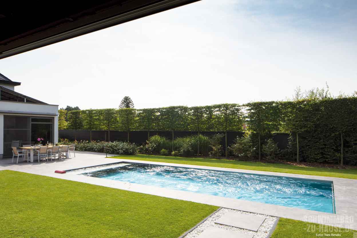 Als Wendy Geens und ihr Mann im letzten Sommer gemeinsam auf einem Grillfest bei guten Freunden im Nachbarort waren und dort in den Genuss einer privaten WellnessOase mit Edelstahlpool kommen durften, stand fest: Das möchten wir auch! „Ich erinnere mich noch genau daran, wie edel das rechteckige Becken war und welch schöne Lichteffekte entstanden, als das Wasser und die Sonne sich im Edelstahl des Beckens reflektierten“, schwärmt Wendy. Besagtes Becken verfügte zudem über einen Flachwasserbereich sowie eine Gegenstromanlage. Beides probierte das Ehepaar Geens sofort aus. Für ihr eigenes Projekt im Garten wünschte sich Wendy allerdings noch etwas mehr: Der Pool sollte um einen Whirlpool, eine Sauna und ein Lounge-Hause in Poolnähe ergänzt werden.